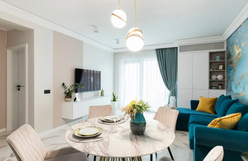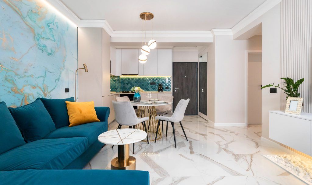 La nivel cromatic, putem regăsi accente de culori jucăușe, în tonuri de albastru marin și turqoise, pe care le „cumințește” un fond neutru, bej. Pardoseala este realizată din plăci ceramice cu efect de marmură, omogenizând întregul spațiu al apartamentului, datorită folosirii acesteia pe toată suprafața pardoselii locuinței.