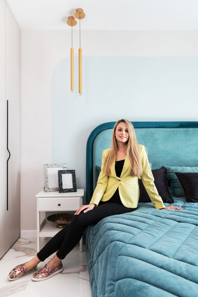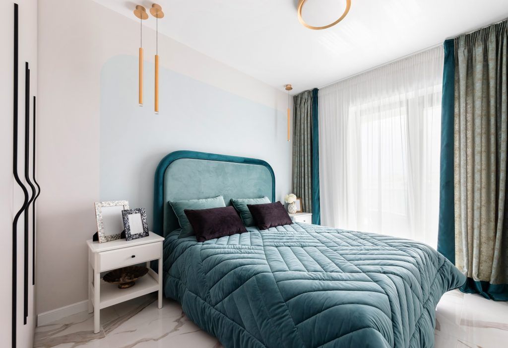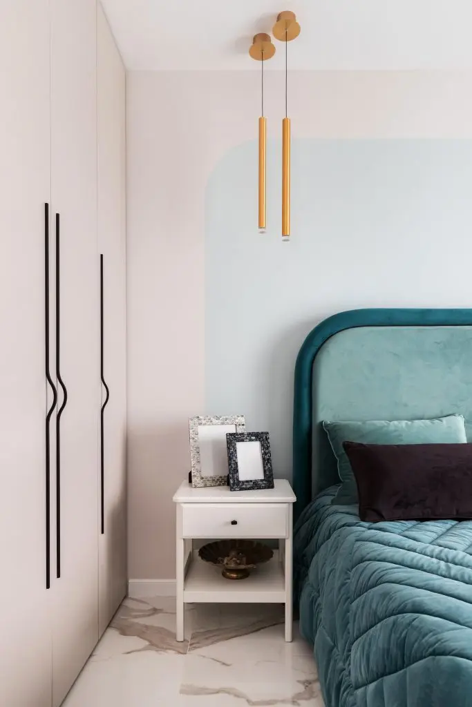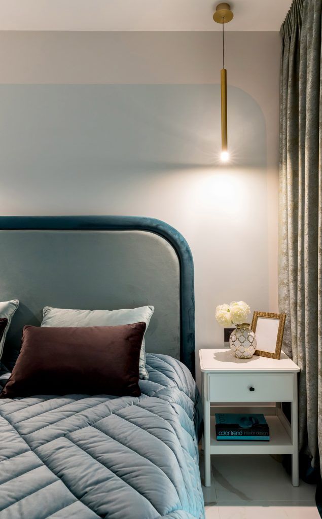 Dormitorul, amplasat la intrarea în apartament, continuă expresia arhitecturală a zonei de zi, având însă o atmosferă mai cozy și mai confortabilă datorită materialelor și finisajelor propuse de arhitecți. Nuanțele de albastru de pe pereți și textile sunt mai domolite, oferind un plus de eleganță și aducând un aer de serenitate și echilibru încăperii.