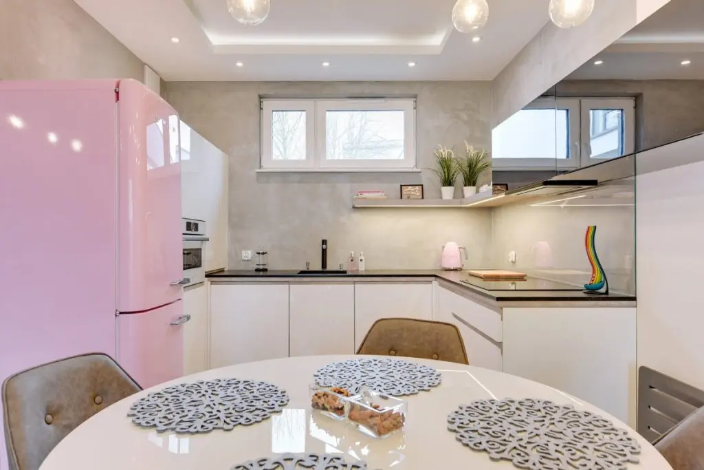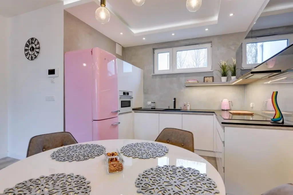 Mobilierul bucatariei are un design minimalist in nonculori lucioase si accentueaza diferentierea celor doua stiluri pozitionandu-se opus frigiderului roz pastelat cu design retro-vintage.