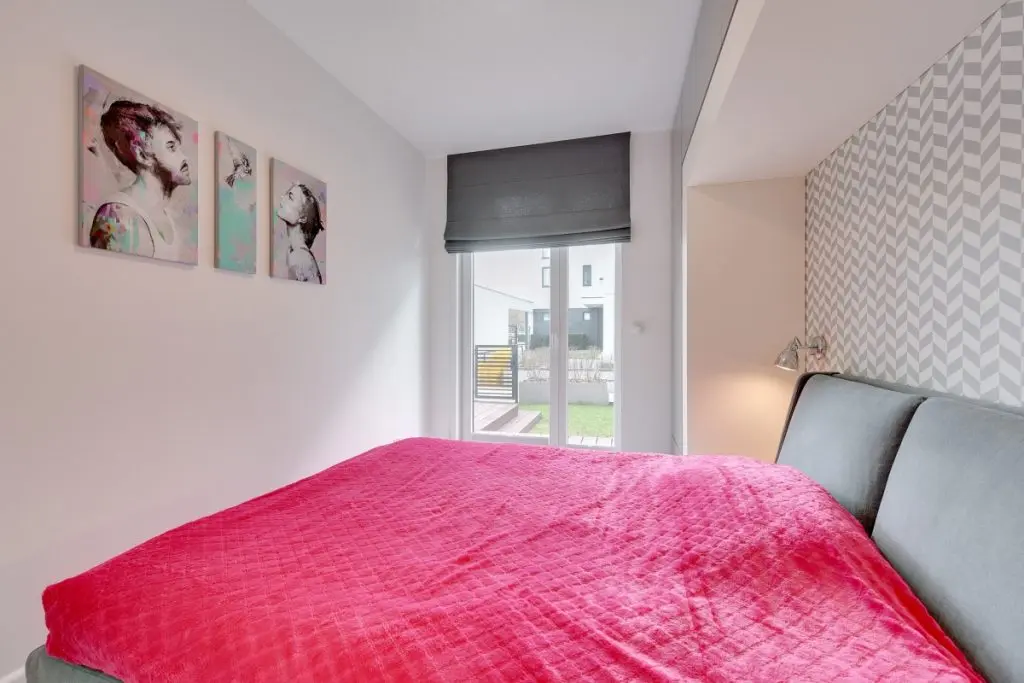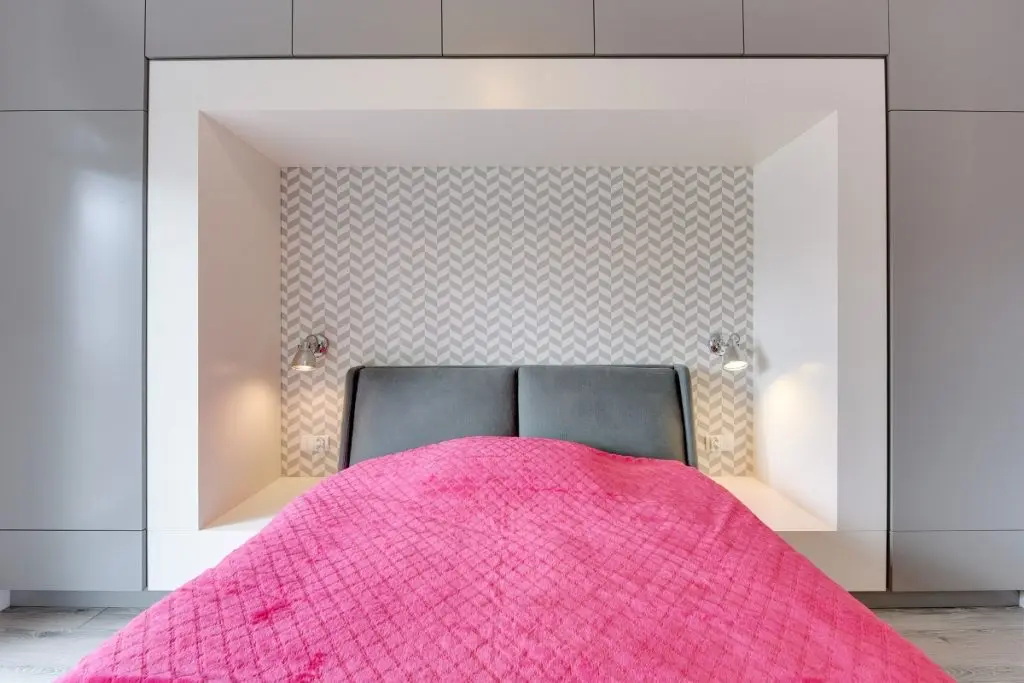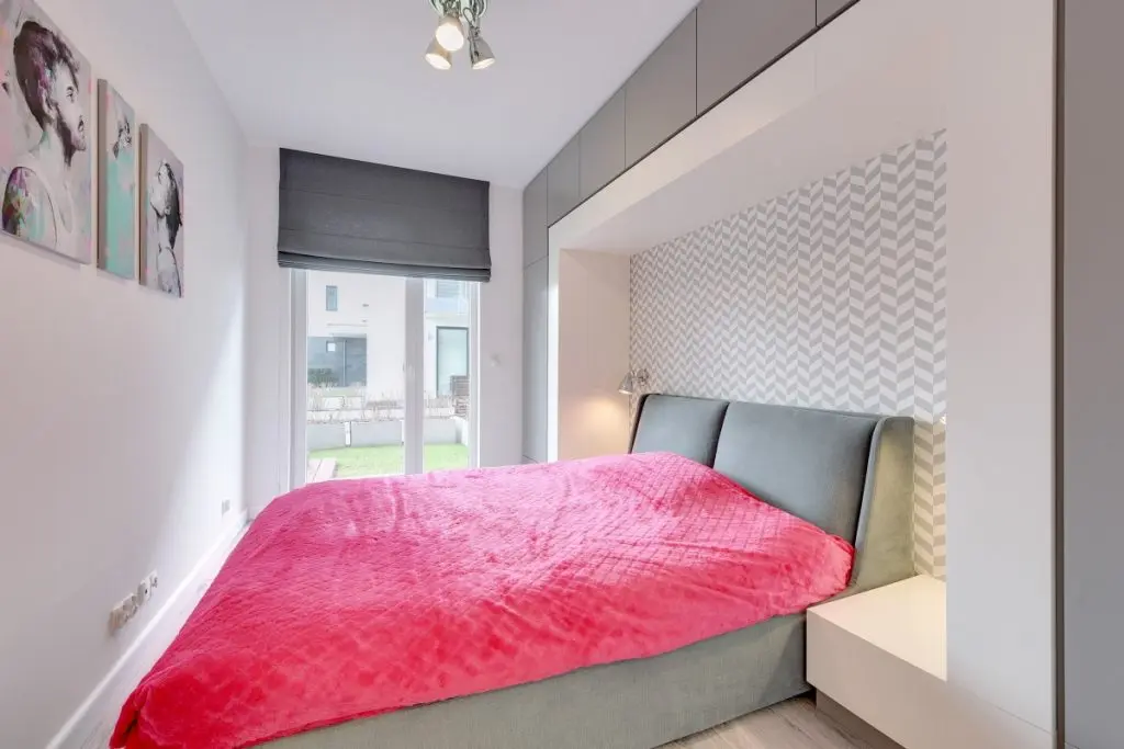 Dormitorul merge pe o singura linie, cea moderna si pastreaza din punct de vedere cromatic accentele celorlalte doua incaperi, mai cu seama nuantele de roz. Aici se pozitioneaza central un pat dublu de dimensiuni generoase, cu un design aparte al tabliei componente. Mobilierul este incastrat pentru a da senzatia de continuitate si a finisa delicat intreaga incapere.