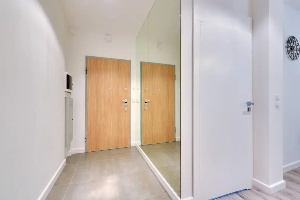 Asa cum putem observa in acest caz, inca de la pasirea in apartamentul prezentat, ne dam seama ca vorbim despre o amenajare dedicata sexului frumos: un dressing impresionant, perfect pentru depozitarea unui numar ridicat de obiecte, acoperit pe intreaga suprafata de elementul cel mai adorat de catre doamne si domnisoare, oglinda.