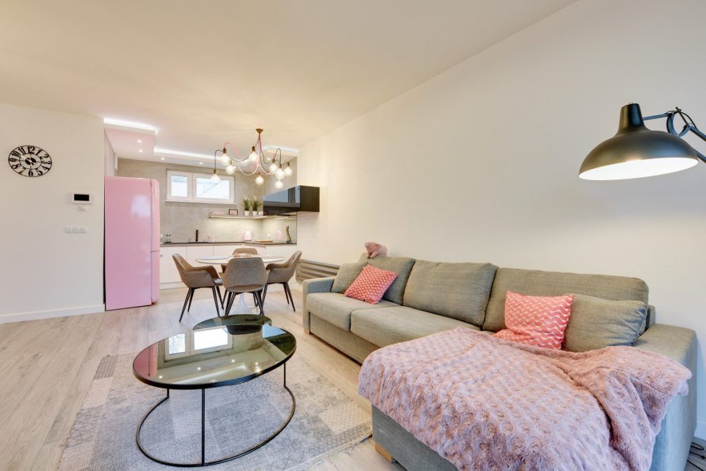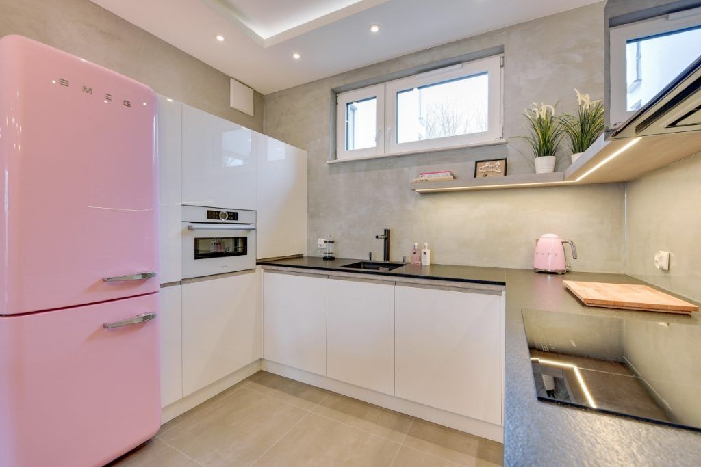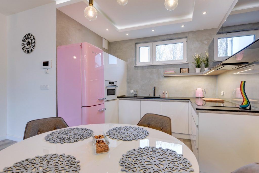 Mobilierul bucatariei are un design minimalist in nonculori lucioase si accentueaza diferentierea celor doua stiluri pozitionandu-se opus frigiderului roz pastelat cu design retro-vintage.