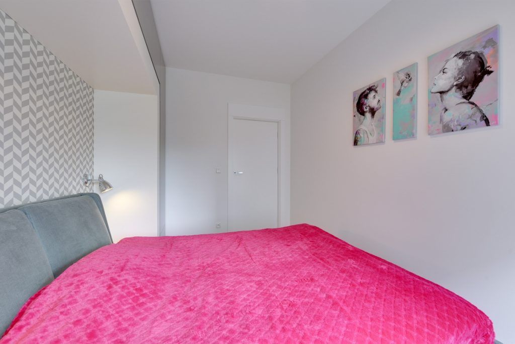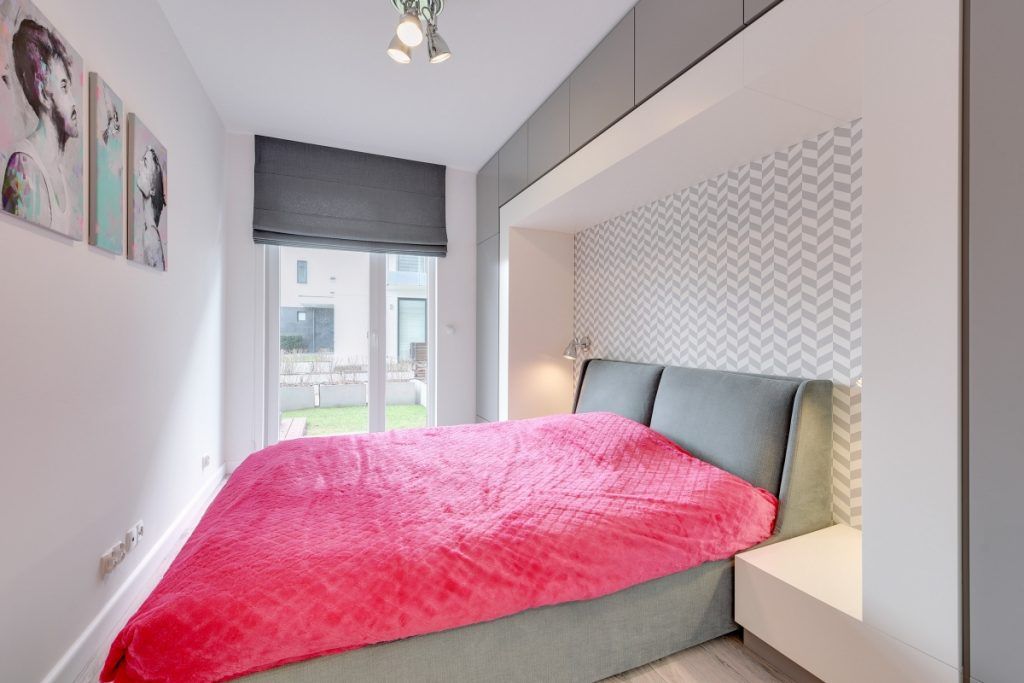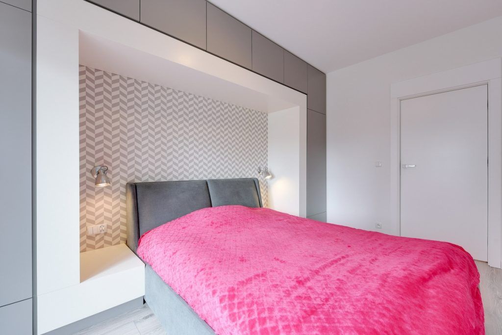 Dormitorul merge pe o singura linie, cea moderna si pastreaza din punct de vedere cromatic accentele celorlalte doua incaperi, mai cu seama nuantele de roz. Aici se pozitioneaza central un pat dublu de dimensiuni generoase, cu un design aparte al tabliei componente. Mobilierul este incastrat pentru a da senzatia de continuitate si a finisa delicat intreaga incapere.