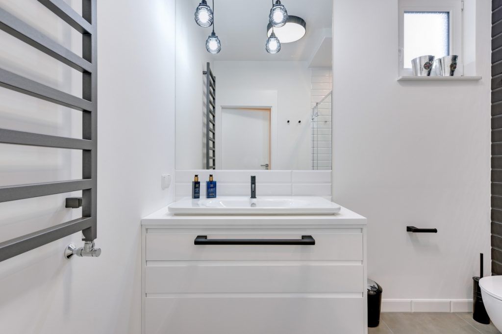 Exact atunci cand ai crezut ca ai inteles pe deplin mesajul transmis de aceasta amenajare, faci cunostiinta cu baia, spatiul care are la baza un design bazat pe cele doua non-culori principale.