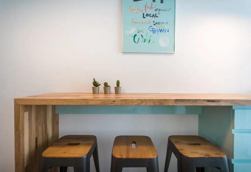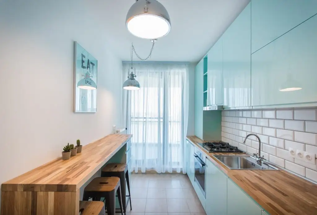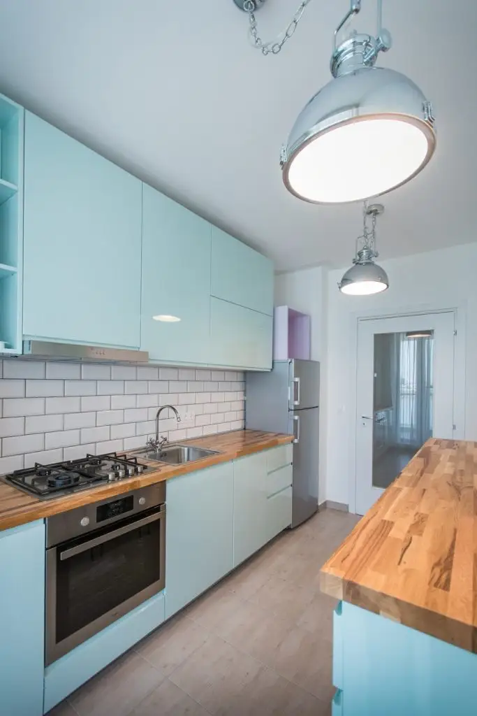 Turcoazulpentru care a optat Oana este, in acelasi timp si o culoare rece, dar si calda, o nuanta care il multumeste si pe el, dar si pe ea. Pentru fronturile dulapurilor s-a folosit M DF vopsit, lucios, cu un design simplu, liniar, iar pentru blatul de lucru si masa, lemn. Zona dintre corpurile de mobilier este decorata cu placi ceramice albe, tip metro, o alegere clasica, cu care nu dai gres.