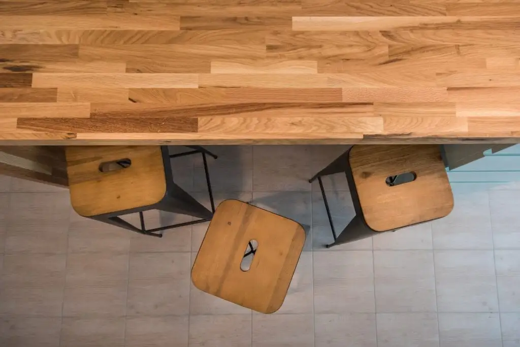 Intreg spatiul se contureaza astfel ca unul luminos si primitor. Corpurile de iluminat de inspiratie industriala aduc un plus de interes amenajarii, in ton cu masa si scaunele tip bar.