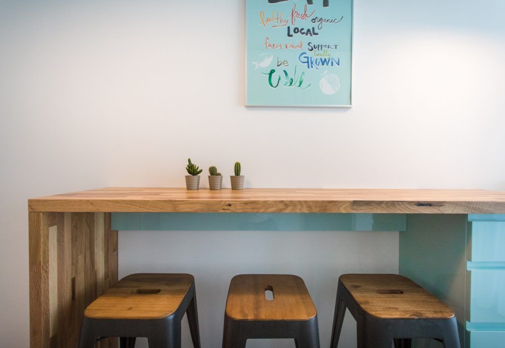 Au fost integrate suficiente spatii de depozitare, in ciuda dispunerii liniare a zonelor de lucru. Un rand de sertare au fost adaugate chiar si mesei, in acelasi turcoaz, subliniind ideea de continuitate.