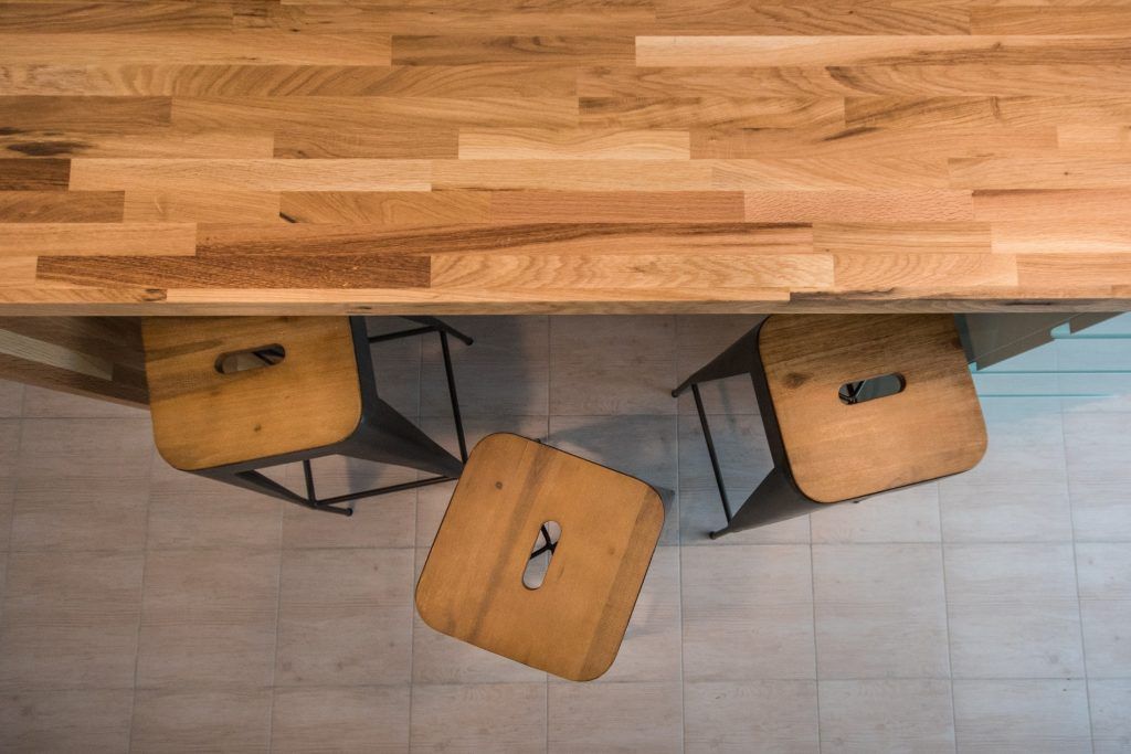 Intreg spatiul se contureaza astfel ca unul luminos si primitor. Corpurile de iluminat de inspiratie industriala aduc un plus de interes amenajarii, in ton cu masa si scaunele tip bar.