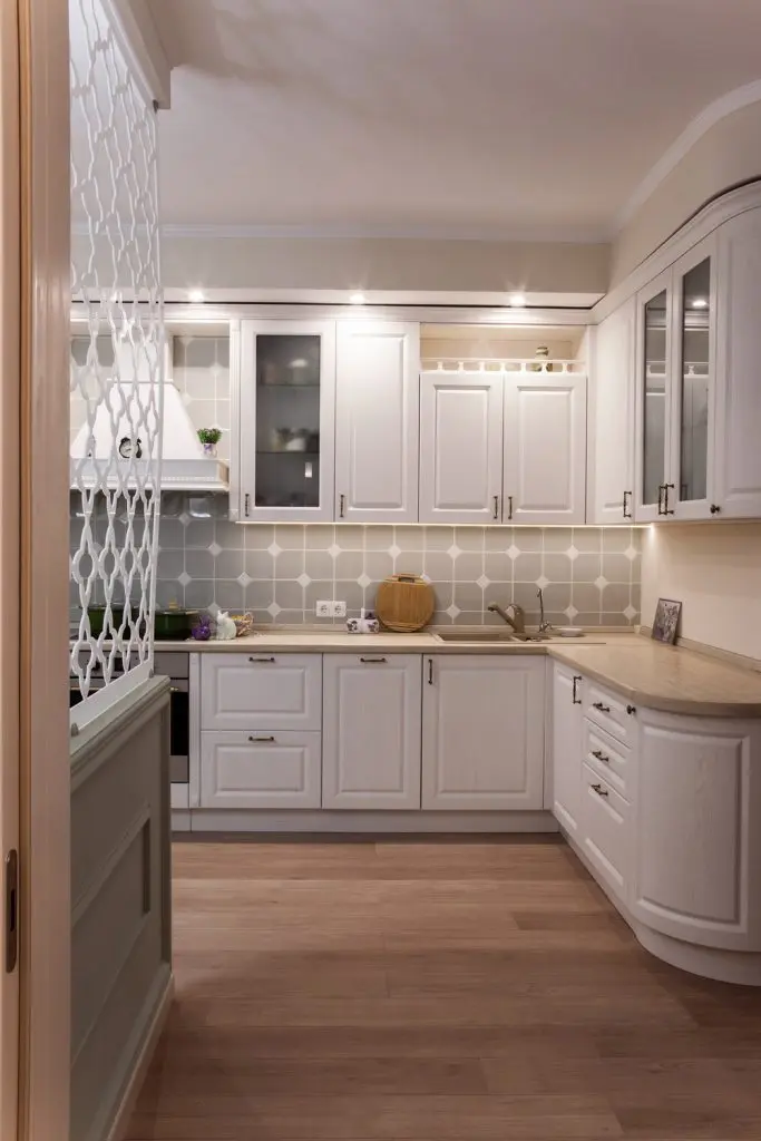 Pentru ca perimetrul de servire a mesei sa aiba un caracter intim si sa nu devina punct de legatura cu celelalte incaperi, bucataria se va imparti in doua zone.