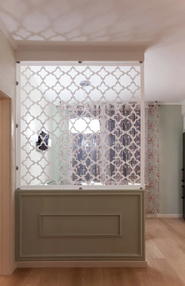 Verdele pal folosit mural, tapetul cu pattern geometric, designul mesei si al scaunelor si draperia cu motive florale, accentueaza ideea de feminitate si romantism, transformand incaperea intr-un loc dedicat relaxarii si socializarii.