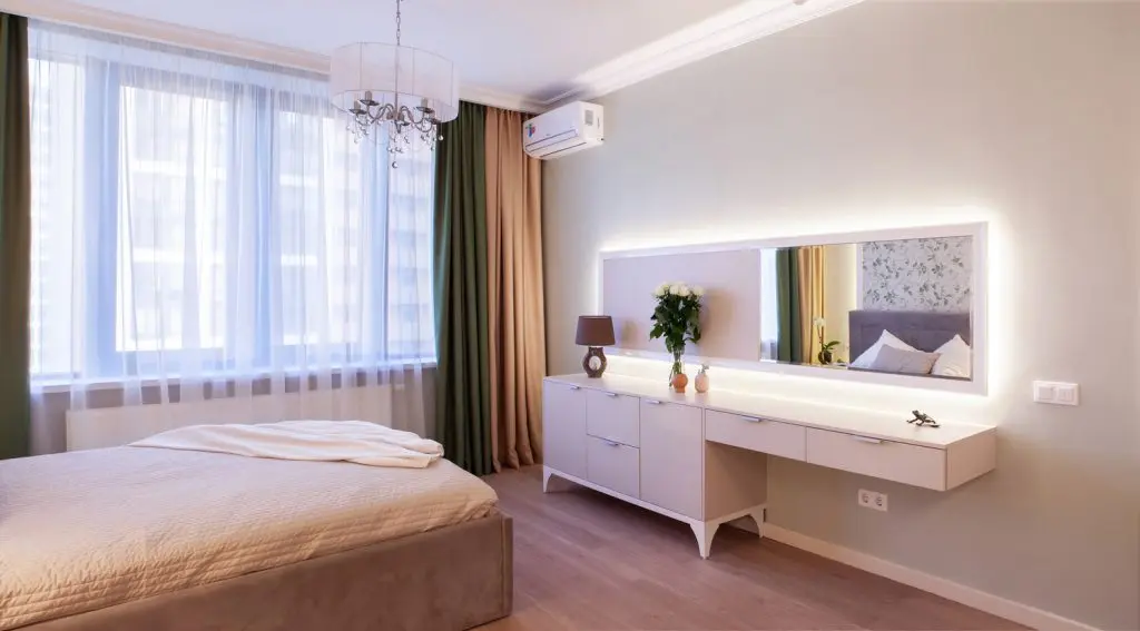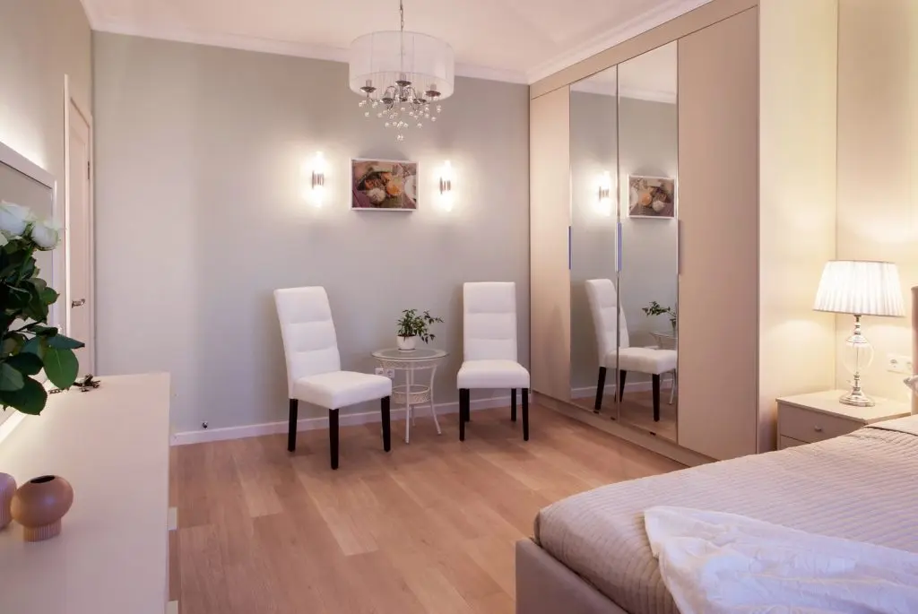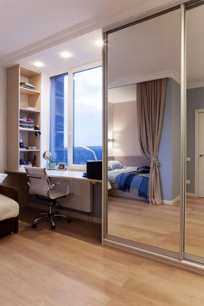 Odata trase acestea, zona de odihna dispare, ramanand in prim plan biroul functional, dressing-ul din oglinzi si o canapea, confortul necesar primirii oaspetilor.