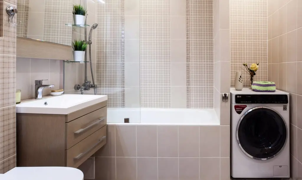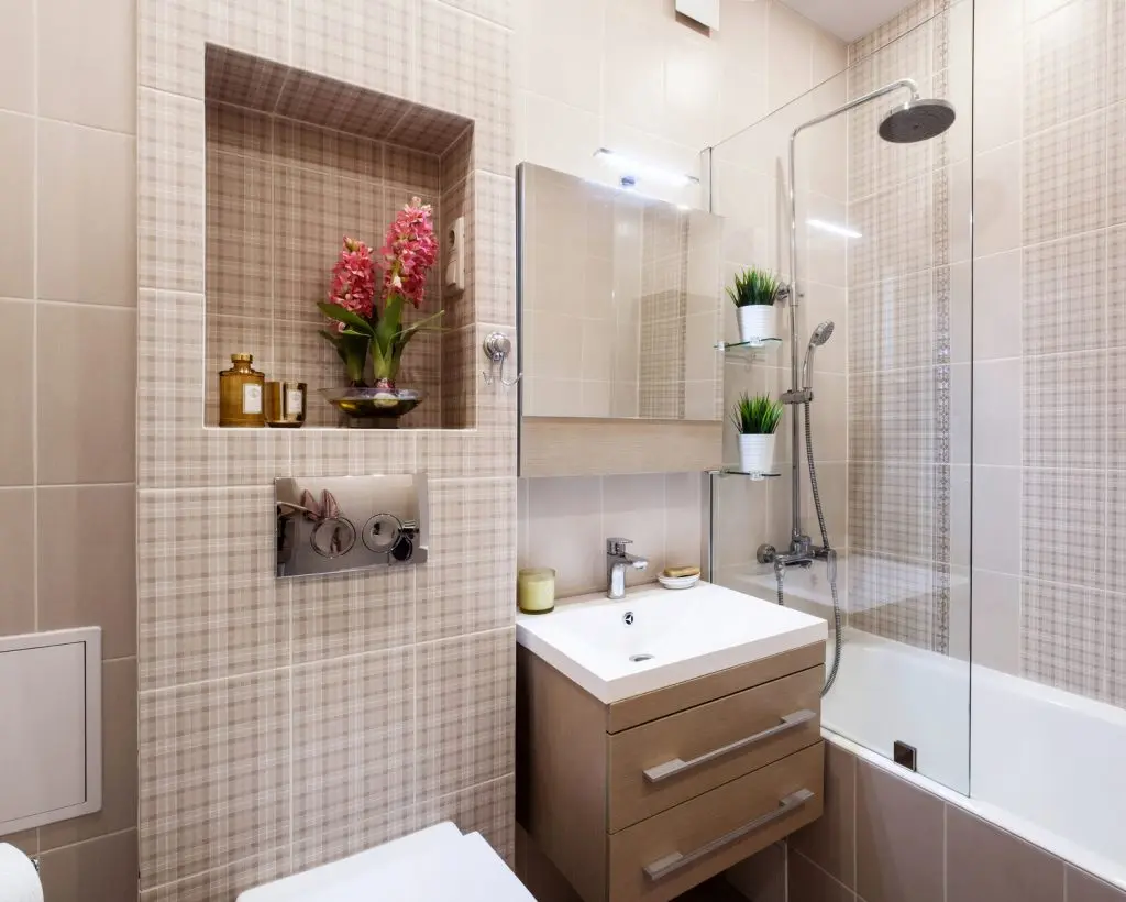 Beige-ul, verdele natural al plantelor decorative si aglomerarea de texturi geometrice, compun in totalitate spatiul sanitar. Vorbim in acest caz de o baie de dimensiuni reduse dar structurata functional astfel incat va permite introducerea electrocasnicelor destinate.