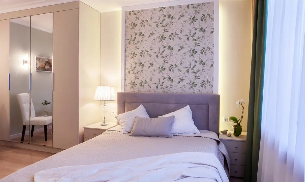 Dormitorul principal transmite un aer cald si varatic prin folosirea elementelor naturale. Acesta se compune dintr-un pat de mijloc de mari dimensiuni in spatele caruia se evidentiaza un tapet inflorat, tapet prin intermediul caruia verdele devine de data aceasta punct de interes.