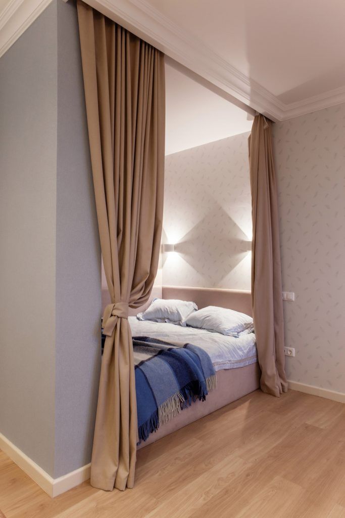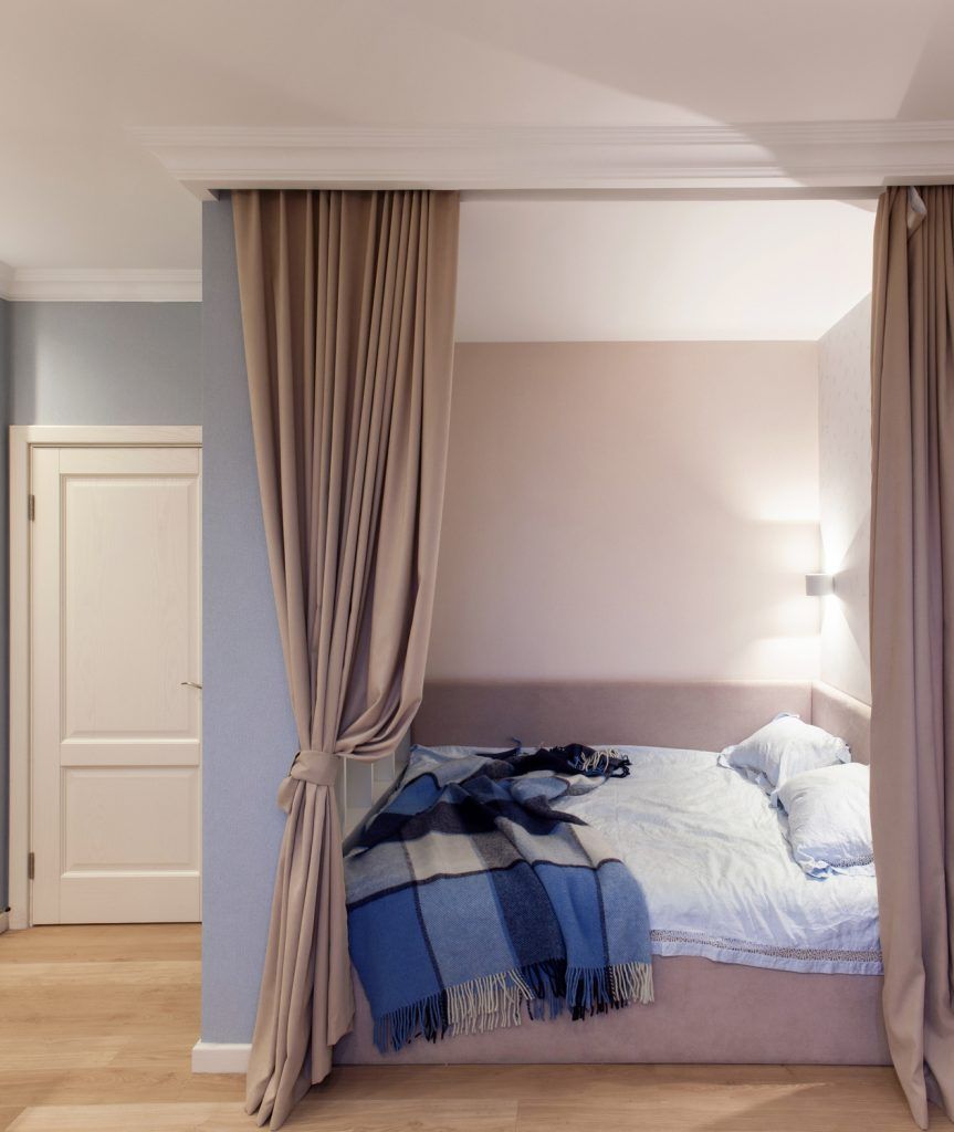 Dormitorul secundar infatiseaza o camera de tineret. Si, pentru ca aceasta este incaperea care se doreste a fi atat loc de odihna si de socializare, cat si de desfasurare a diferitelor sarcini, repartizarea rolurilor acestei camere poate fi o adevarata provocare. Pentru a obtine un spatiu intim delimitat, patul se ascunde in spatele unor draperii de mari dimensiuni.