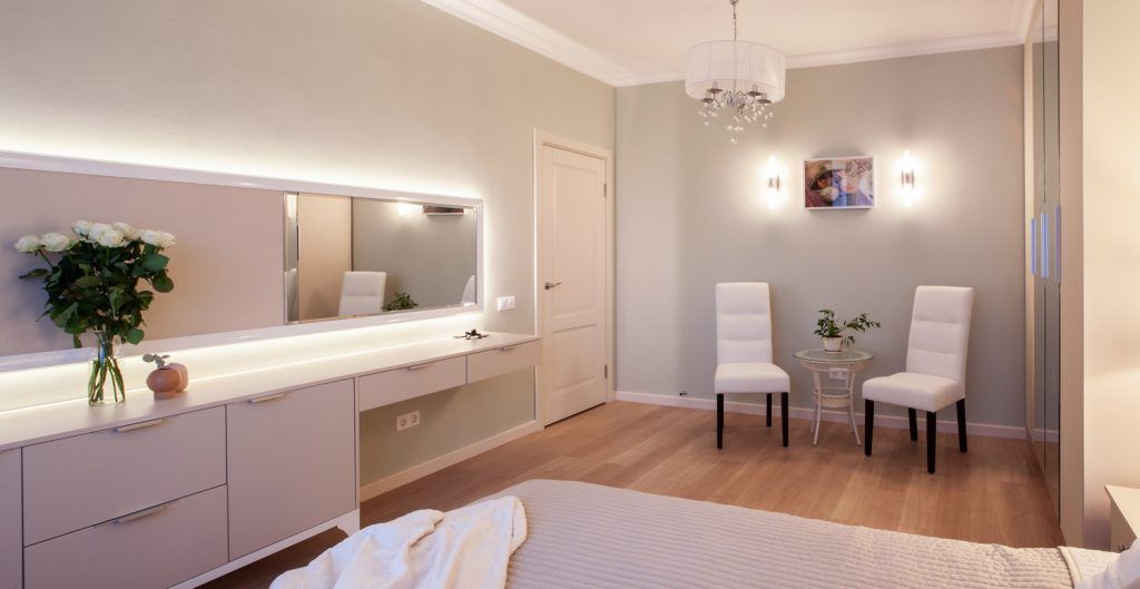 Odata trase acestea, zona de odihna dispare, ramanand in prim plan biroul functional, dressing-ul din oglinzi si o canapea, confortul necesar primirii oaspetilor.