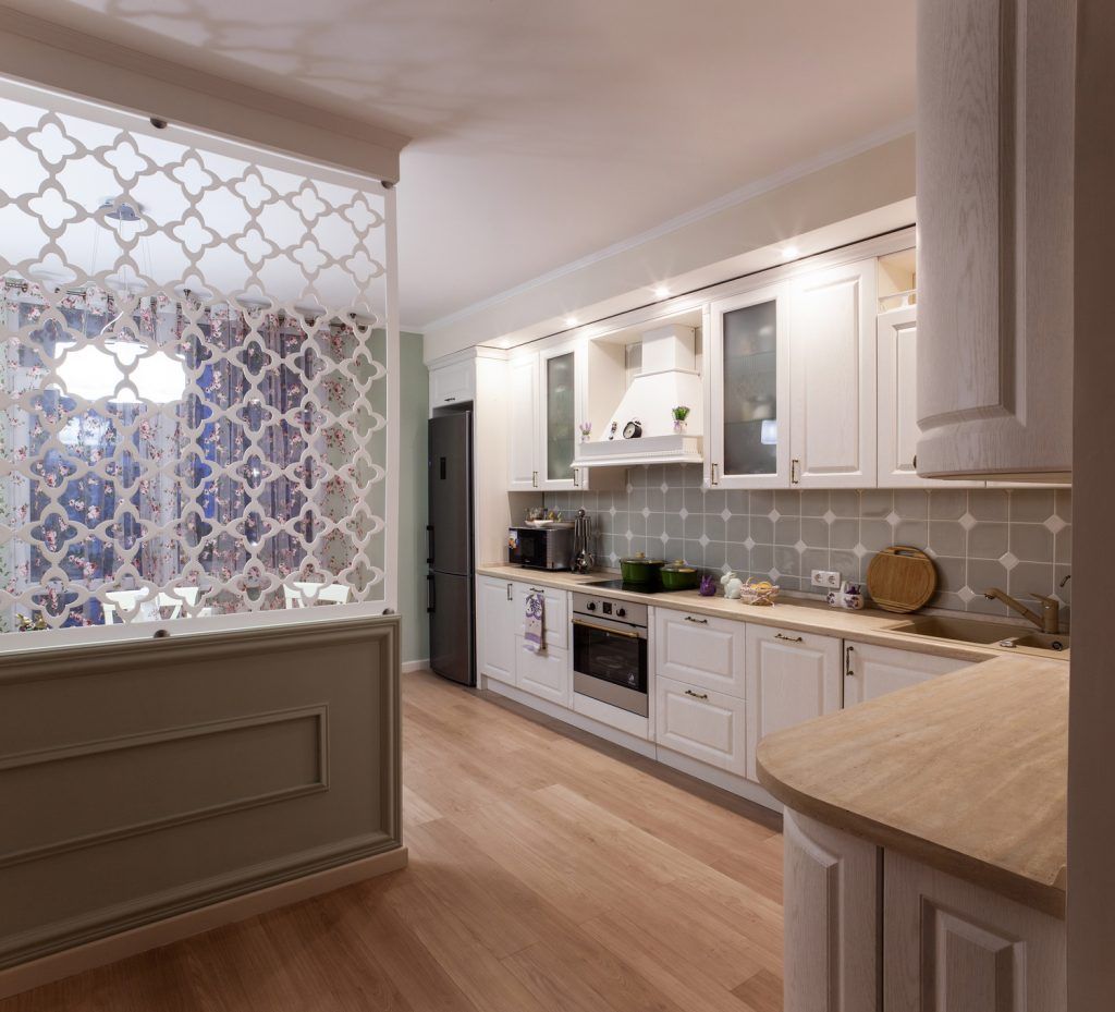 Pentru ca perimetrul de servire a mesei sa aiba un caracter intim si sa nu devina punct de legatura cu celelalte incaperi, bucataria se va imparti in doua zone.