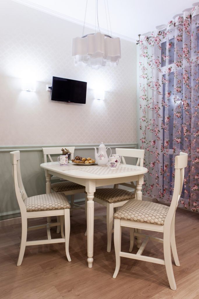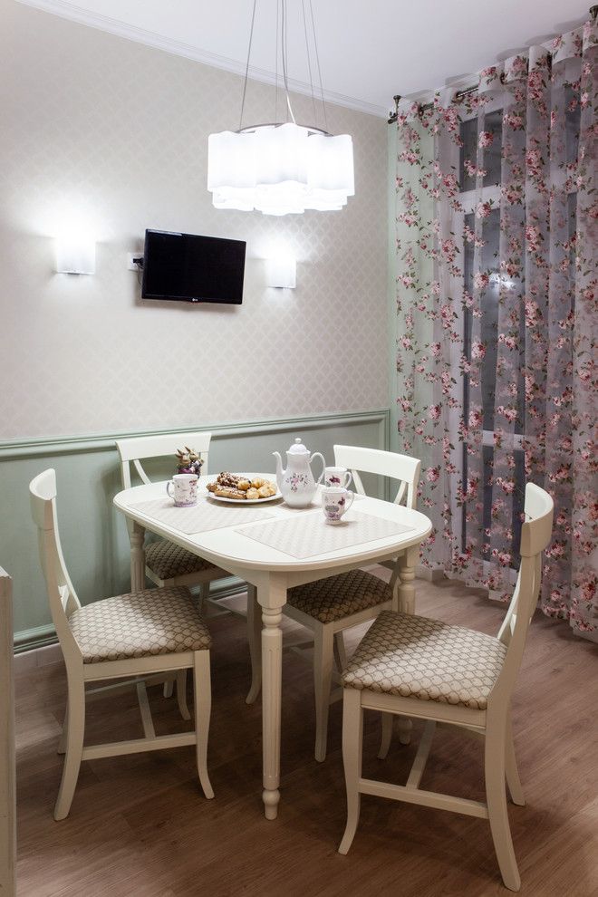 Verdele pal folosit mural, tapetul cu pattern geometric, designul mesei si al scaunelor si draperia cu motive florale, accentueaza ideea de feminitate si romantism, transformand incaperea intr-un loc dedicat relaxarii si socializarii.
