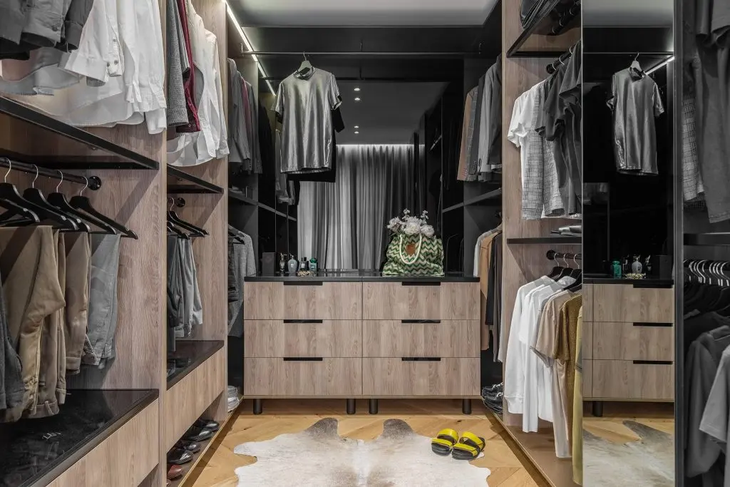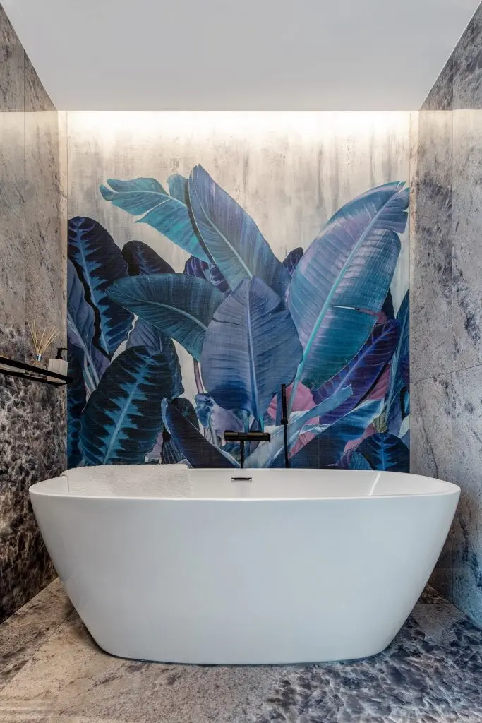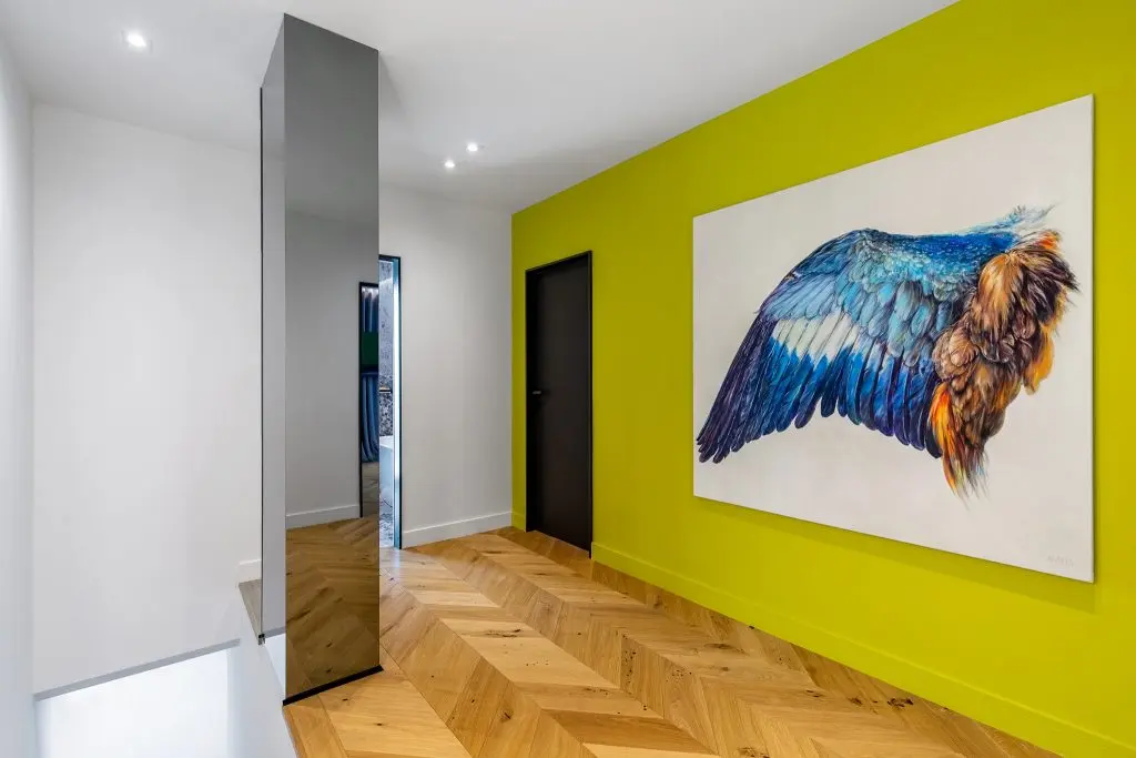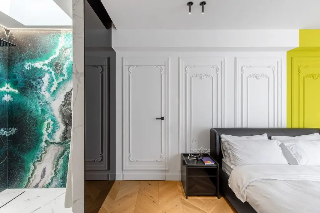 In spatele lui regasim cinci rame de inspiratie clasica (realizate din duropolimer) care mascheaza prin stereotomia lor usa de intrare in camera si usa catre dressing. Ambele usi sunt de tip filomuro, astfel incat se incadreaza perfect in desenul peretelui.
