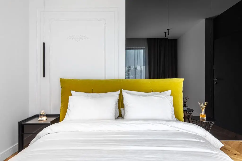 O insertie asimetrica de dunga vopsita galben citron pe peretele din spatele patului marcheaza personalitatile beneficiarilor.