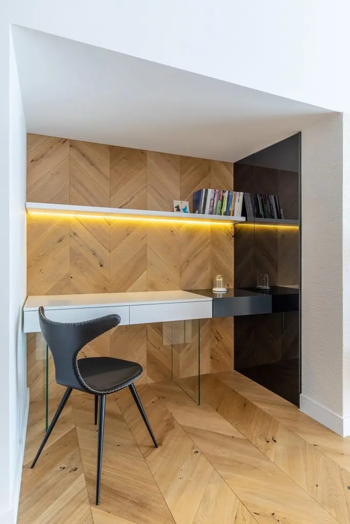 Personalizarea si realizarea pieselor la comanda joaca un rol esential in povestea acestei amenajari. De la parchetul model chevron, alea carui piese au fost taiate special, la C NC, dupa dimensiunile necesare , la tot ce inseamna mobilier tapitat si spatii de depozitare.