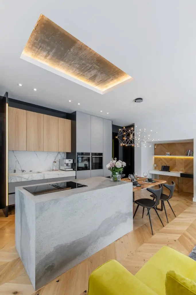 “Zona de gatit este conturata prin marmura abstractizata in care am montat o plita cu hota inclusa in ea, continuand vis-a-vis cu zona de insula formata dintr-un blat din monobloc de beton aparent, de el fiind prinsa placa din lemn de stejar cu toate detaliile la vedere. “