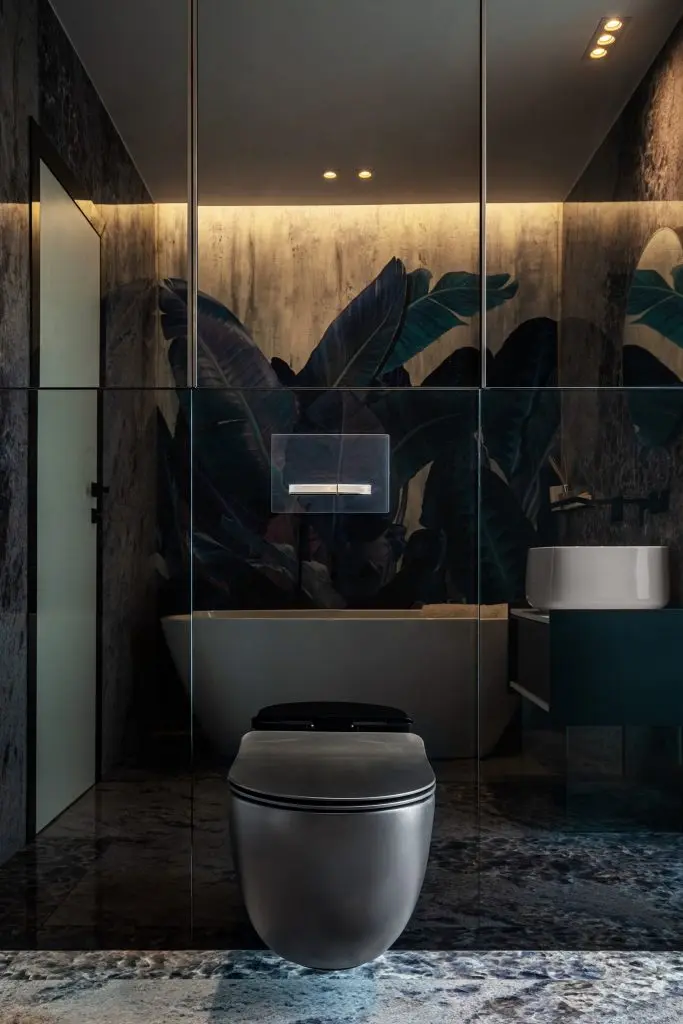 La intrarea in locuinta a fost gandita o baie amenajata ca o opera de arta.. Fiind o baie secundara, s-a renuntata la clasica oglinda de deasupra lavoarului, iar sanitarele albe au fost inlocuite cu piese de impact, intr-o nuanta placuta de turquoise mat.