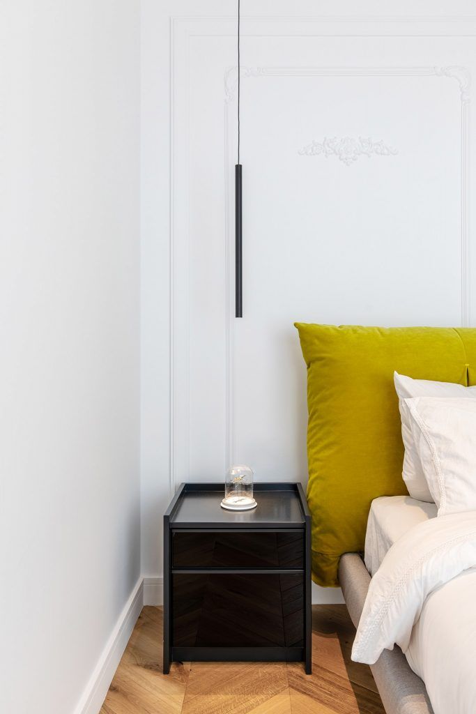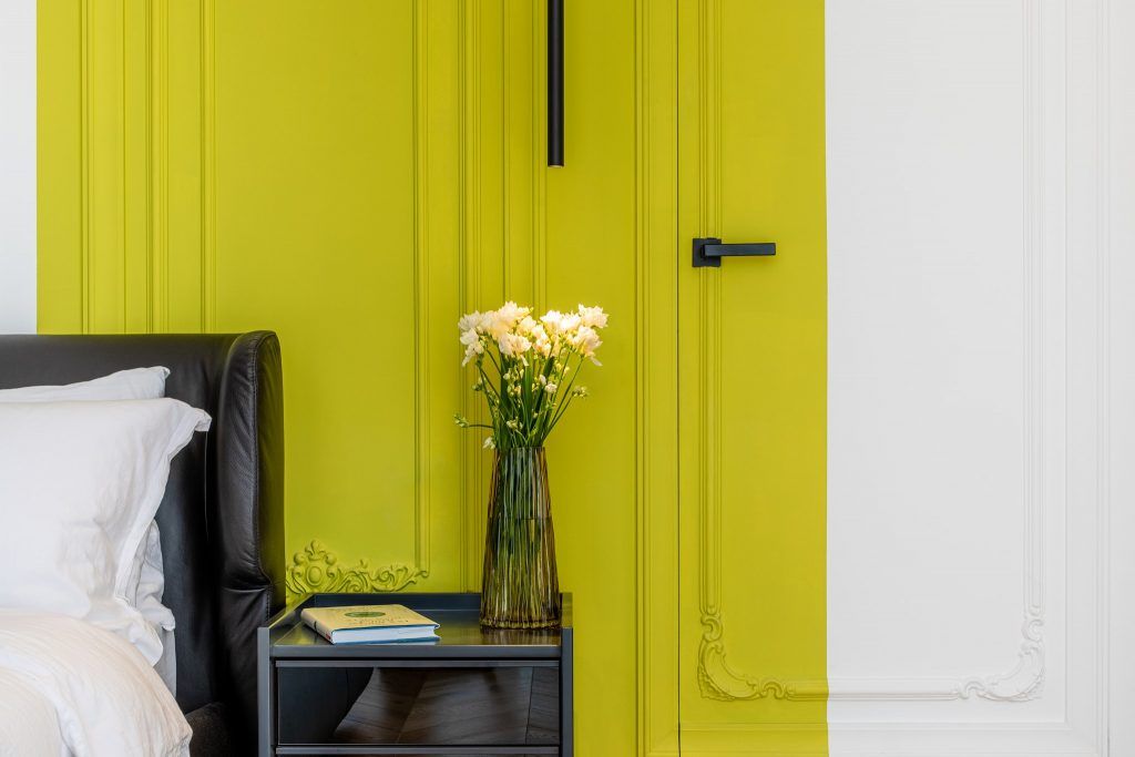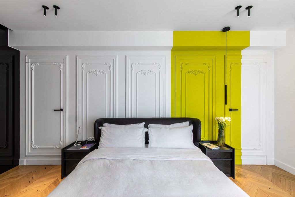 O insertie asimetrica de dunga vopsita galben citron pe peretele din spatele patului marcheaza personalitatile beneficiarilor.