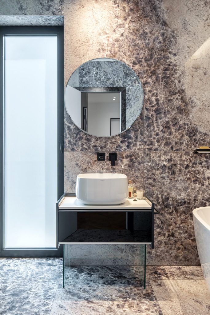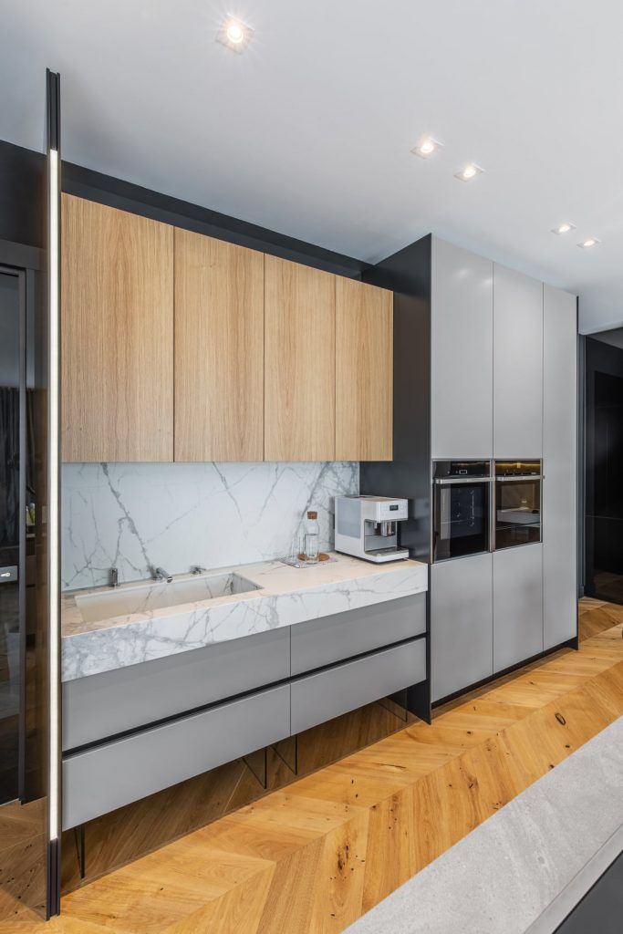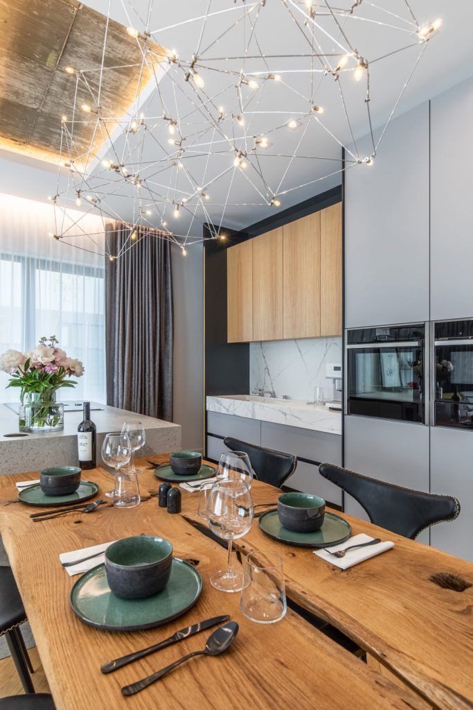 “Zona de gatit este conturata prin marmura abstractizata in care am montat o plita cu hota inclusa in ea, continuand vis-a-vis cu zona de insula formata dintr-un blat din monobloc de beton aparent, de el fiind prinsa placa din lemn de stejar cu toate detaliile la vedere. “