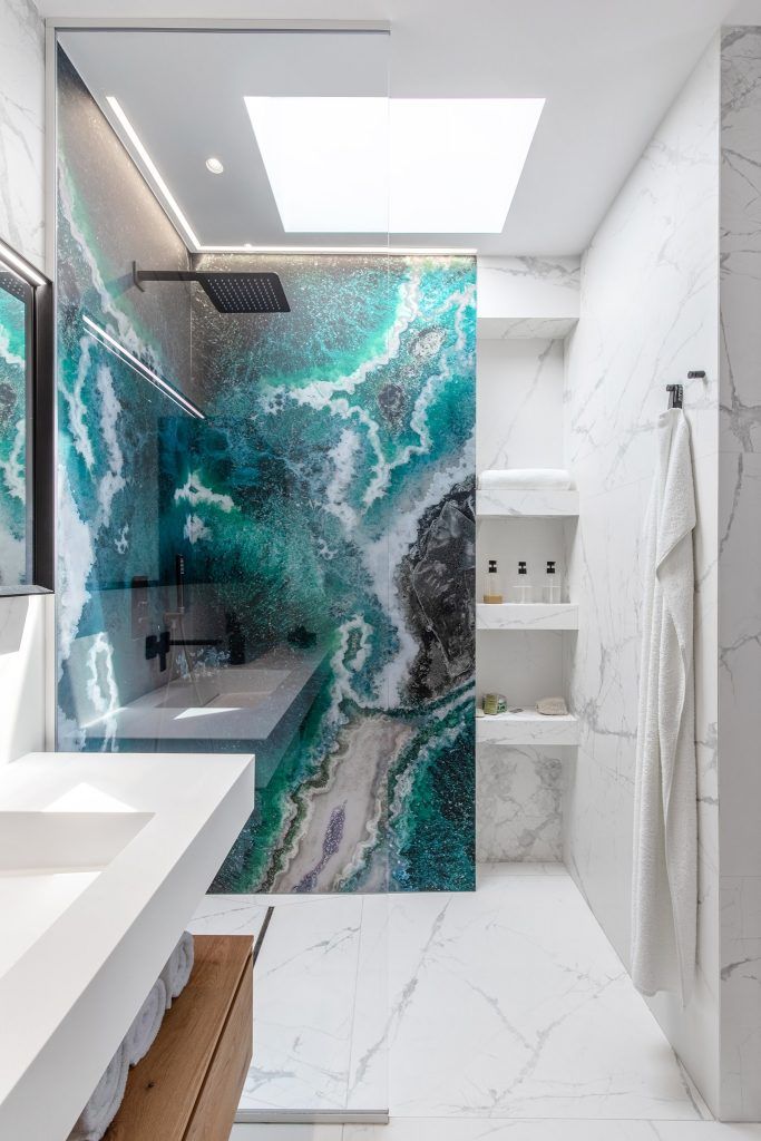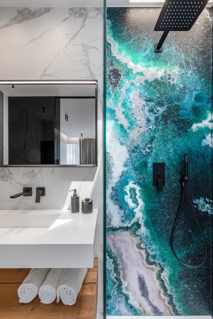 La intrarea in locuinta a fost gandita o baie amenajata ca o opera de arta.. Fiind o baie secundara, s-a renuntata la clasica oglinda de deasupra lavoarului, iar sanitarele albe au fost inlocuite cu piese de impact, intr-o nuanta placuta de turquoise mat.