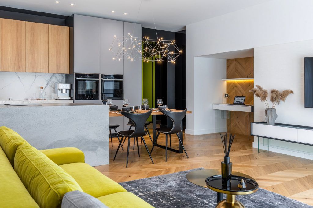Spatiul principal al amenajarii il constituie suprafata generoasa compusa din living, bucatarie si o zona de lucru (gandita minimalist si bine delimitata), toate abordand stiluri si cromatici diferite.