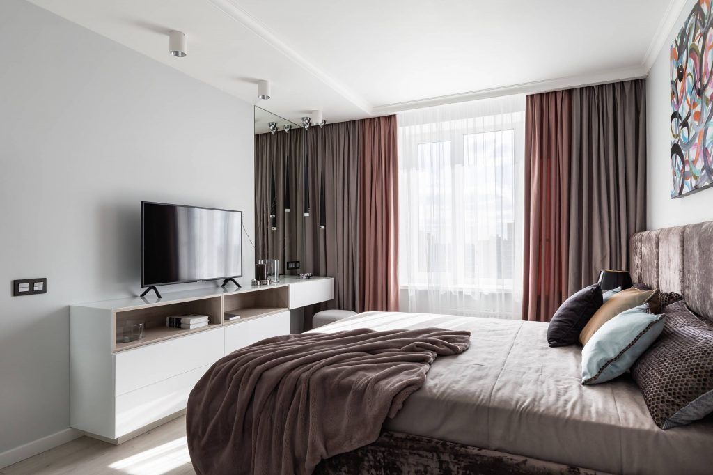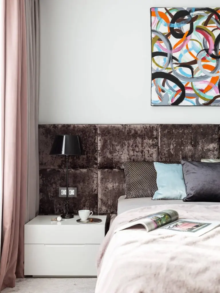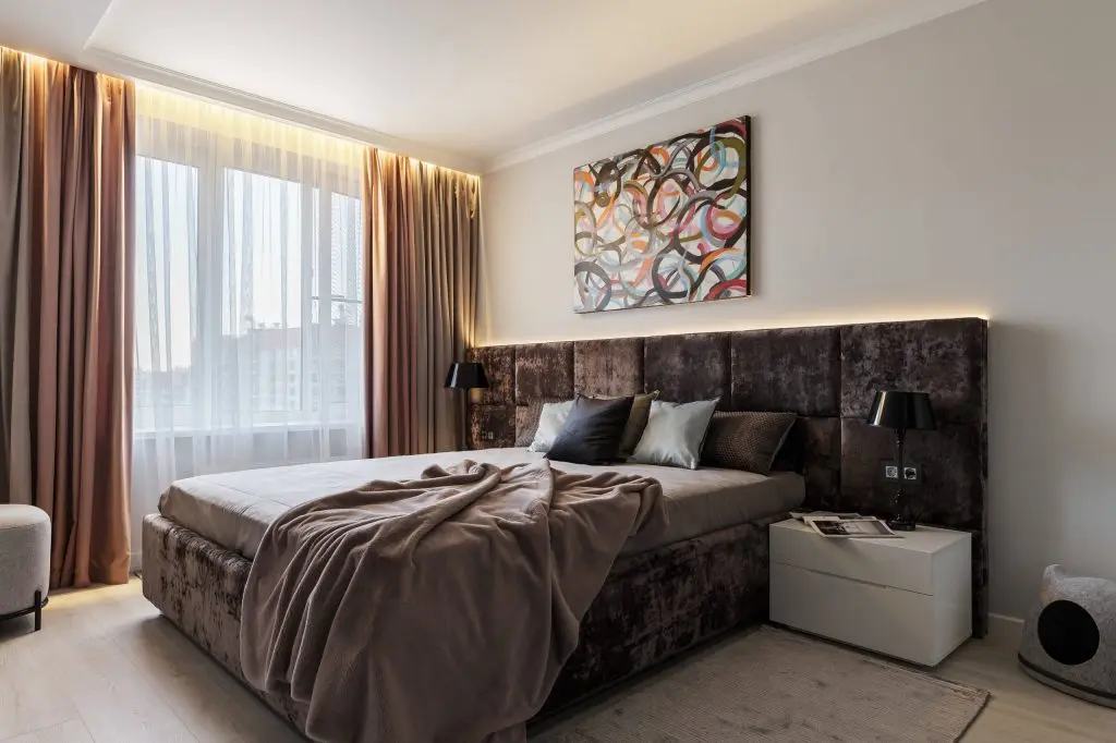 Iluminarea artificiala aduce componente moderne, suspendate si leduri ascunse in galeria draperiei si in spatele tabliei. Prin adaugarea picturii abstracte se creeaza o continuitate cu living-ul, aceasta devenind o eticheta a spatiilor destinate relaxarii.