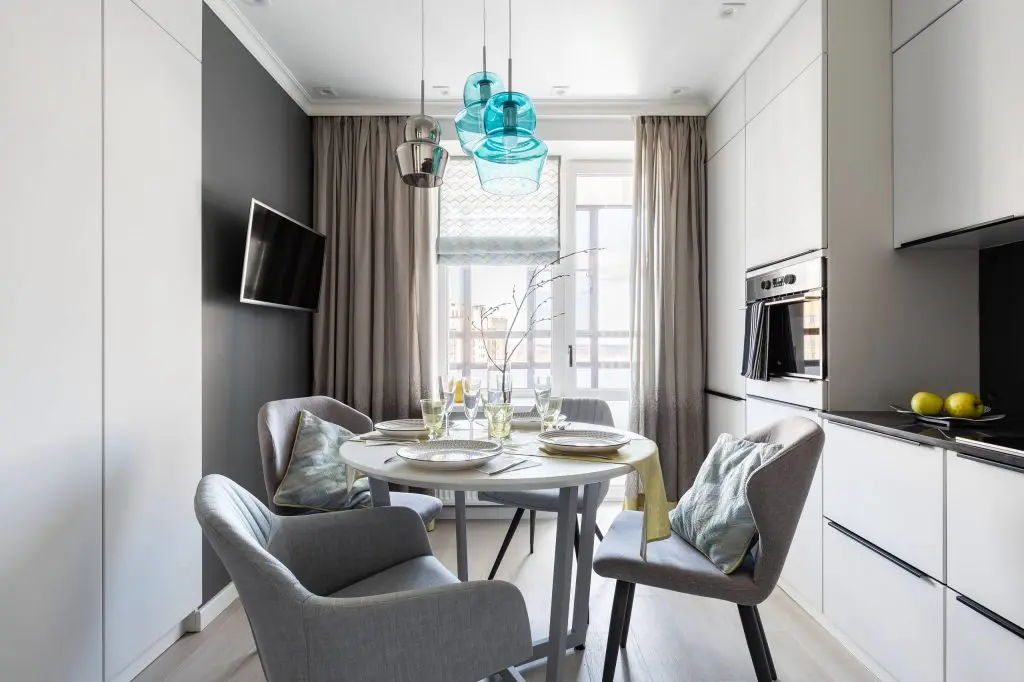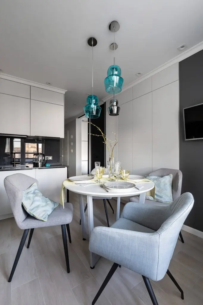Zona de servire a mesei aduga un plus atmosferei relaxante prin cele patru scaune confortabile, cu aspect de fotoliu. Lumina naturala patrunde din plin pe timpul zilei, cea de a doua jumatate evidentiindu-se romantic cu ajutorul corpurilor de iluminat suspendate, cu design modern.