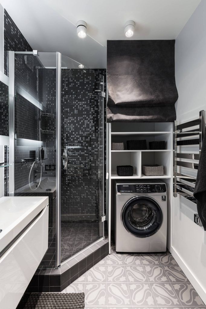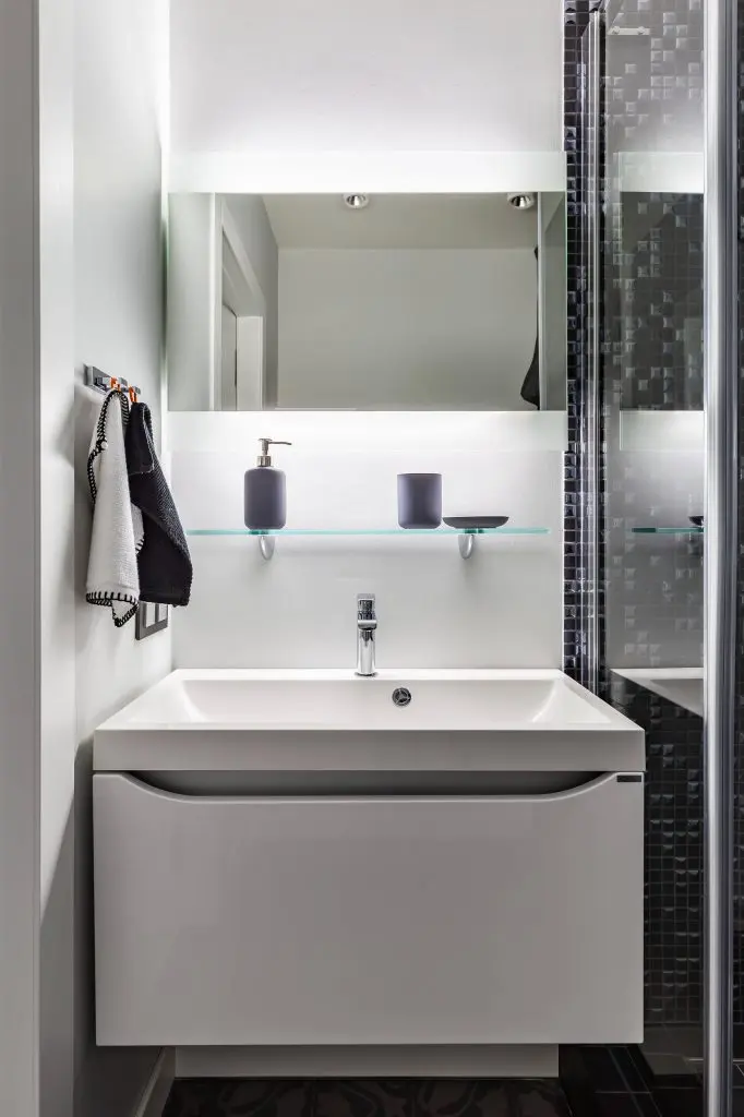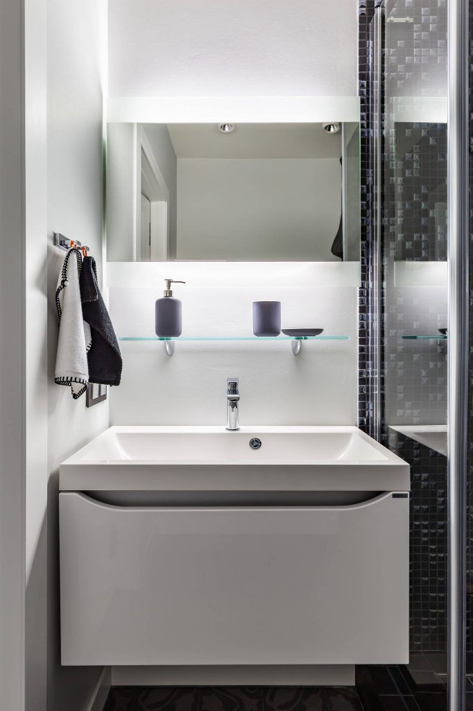 Amestecul simetric al non culorilor vorbeste in cazul baii. Luxul si eleganta se imbina cu functionalitatea prin mobilierul minimalist si spatiul dedicat depozitarii. Sticla si oglina sunt elemente evidentiate de lumina rece a benzilor de led, lumina care este reflectata si de catre elementele metalice.
