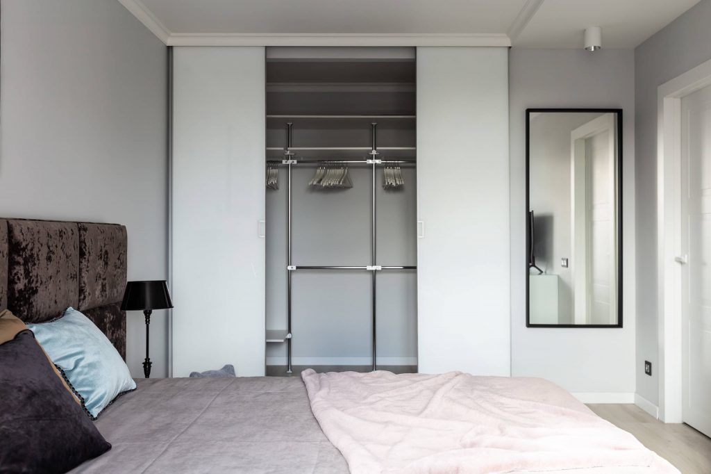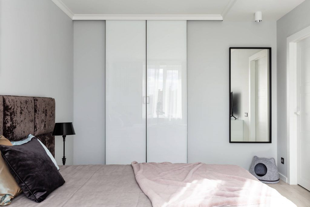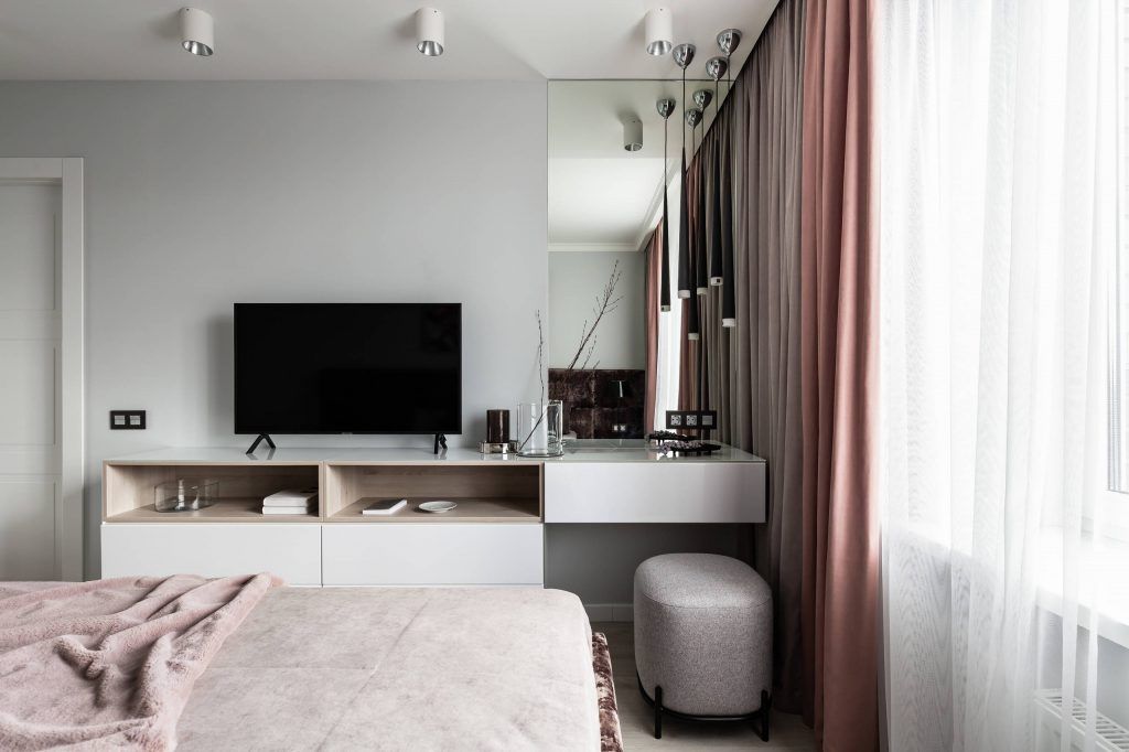 Minimalismul se remarca in mobilier unde, functionalitatea capata un rol important, mai ales in cazul dressing-ului ascuns in perete. Tot aici regasim si un colt destinat activitatilor de infrumusetare, reprezentat de o oglinda de mari dimensiuni, o masuta pentru machiaj si un taburete tapitat.