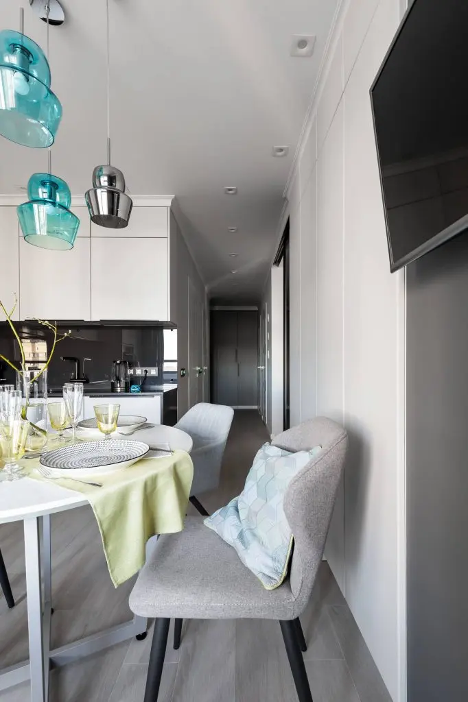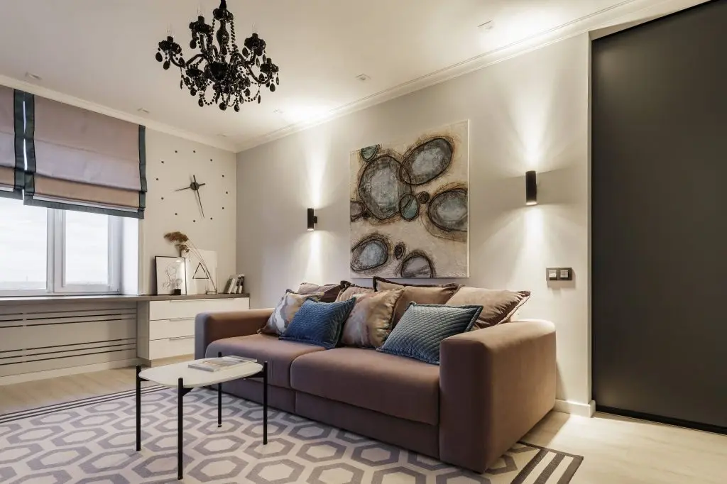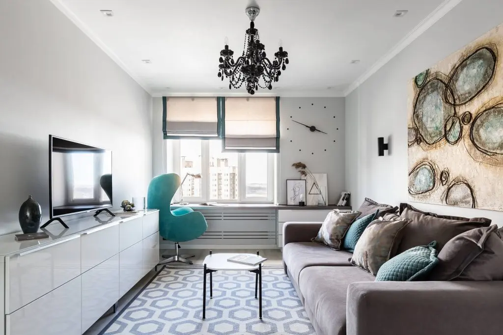 Linving-ul vine cu o poveste artistica ce suprapune doua spatii temporale diferite. Dressing-ul si comoda, prin design-ul liniar, par ca se indentifica peretii pe care se regasesc, lasand astfel loc celorlalte componente sa sa isi exercite influenta. Astfel, fotoliul colorat si candelabrul cu aspect vintage, reusesc sa capteze atentia prin design-ul special.