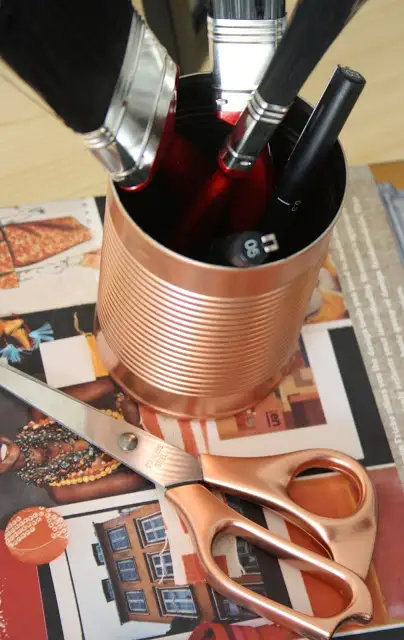Iti mai trebuie un tub de spray de culoare aramie, cuprul fiind una dintre culorile momentului in acest an si poti incepe sa vopsesti, cu grija si eleganta, toate aceste conserve pe care altfel le-ai fi aruncat la gunoi fara a le aprecia valoarea estetica.