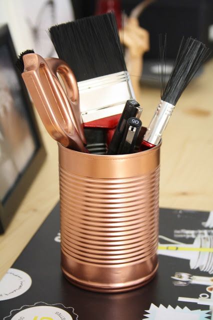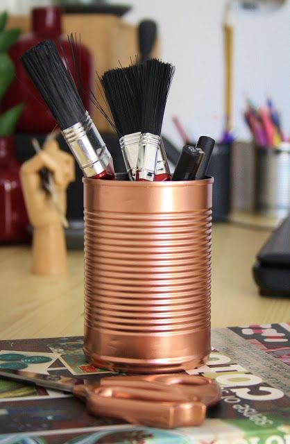 Iti mai trebuie un tub de spray de culoare aramie, cuprul fiind una dintre culorile momentului in acest an si poti incepe sa vopsesti, cu grija si eleganta, toate aceste conserve pe care altfel le-ai fi aruncat la gunoi fara a le aprecia valoarea estetica.