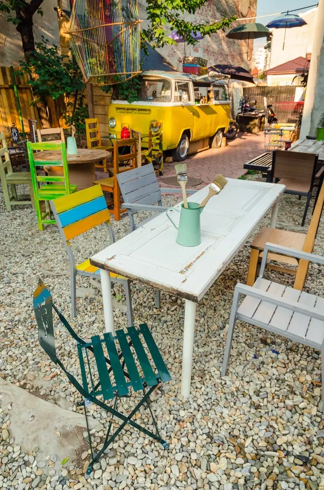 O parte din scaune sunt achizionate din Sighetul Marmatiei si o alta este reciclata cu ajutorul amicilor de la atelierul Woodyo si pictate patinat pentru a se incadra in decor. Altele sunt noi si au vopsite in cadrul unui proiect de mobilizare a prietenilor: Friendly painting, unde fiecare are propriul scaun vopsit la Acuarela.