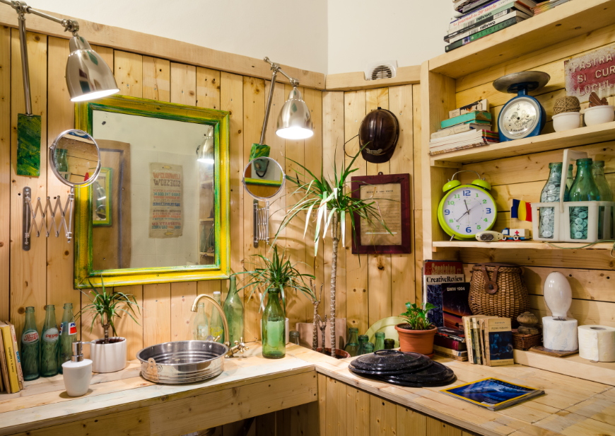 In final, poate ca aceste limitari ne-au fortat sa fim mai creativi. De exemplu, am modificat minimal baile, imbracand cada in lemn si mascand-o cu o biblioteca plina de obiecte nostalgice colorate, o baie care a fost votata in 2011 drept cea mai frumoasa baie din localurile din Bucuresti.