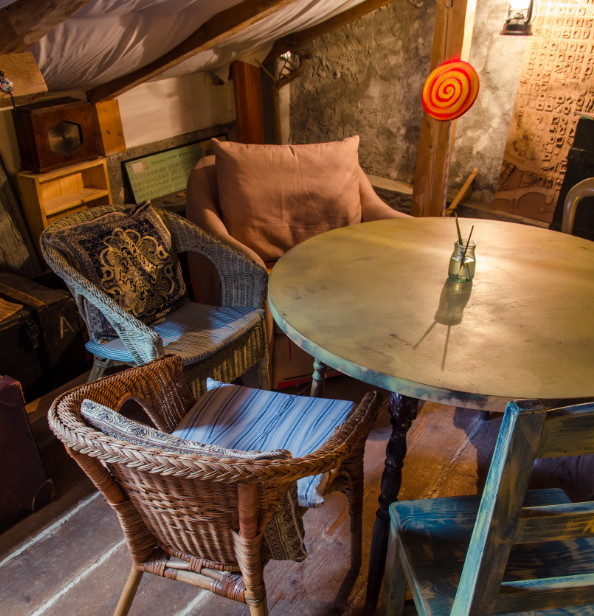 O parte din scaune sunt achizionate din Sighetul Marmatiei si o alta este reciclata cu ajutorul amicilor de la atelierul Woodyo si pictate patinat pentru a se incadra in decor. Altele sunt noi si au vopsite in cadrul unui proiect de mobilizare a prietenilor: Friendly painting, unde fiecare are propriul scaun vopsit la Acuarela.