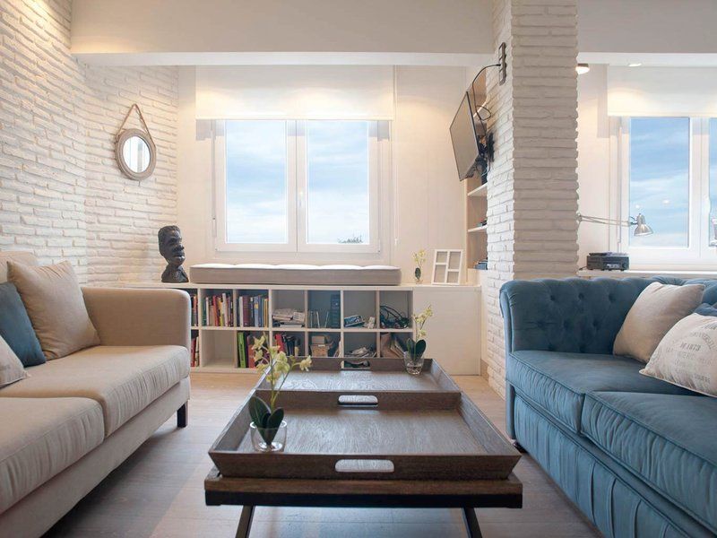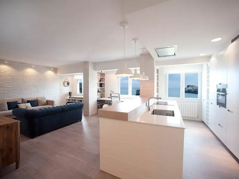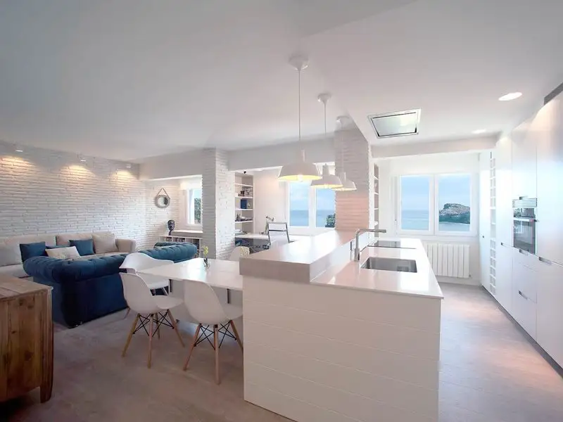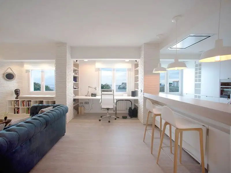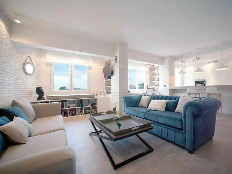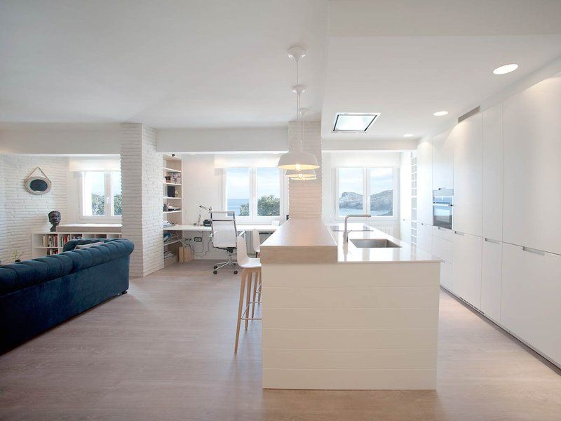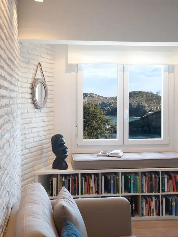 Avand o vedere panoramica la mare, nu e de mirare ca albul si accentele de albastru predomina in interioarele acestei locuinte. Este refugiul unui scriitor, ce locuieste singur, iar spatiul si l-a dorit ca o amenajare simpla, moderna, cu spatiu de lucru cu vedere spre mare, dar si loc de socializare si primit prieteni in vizita.