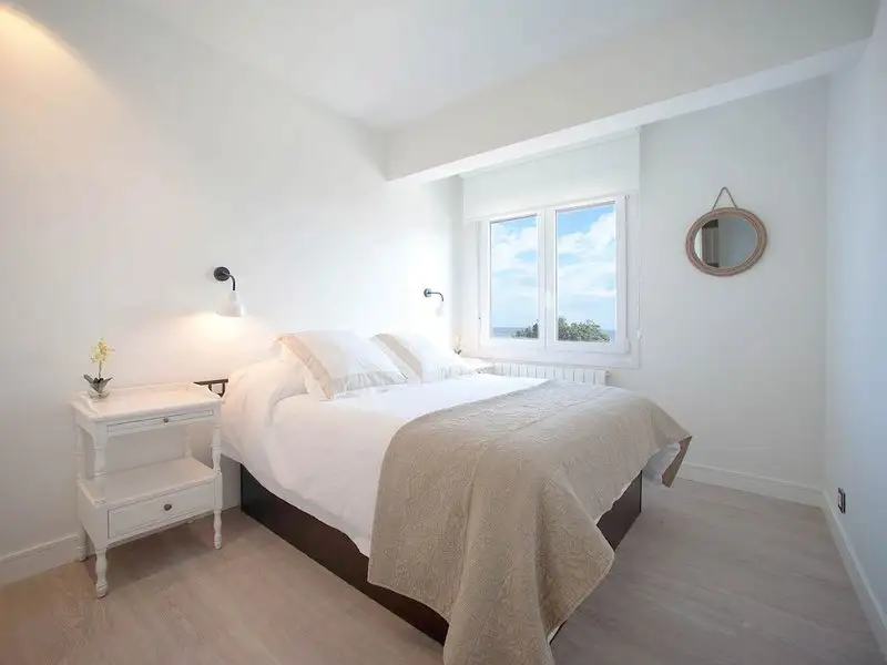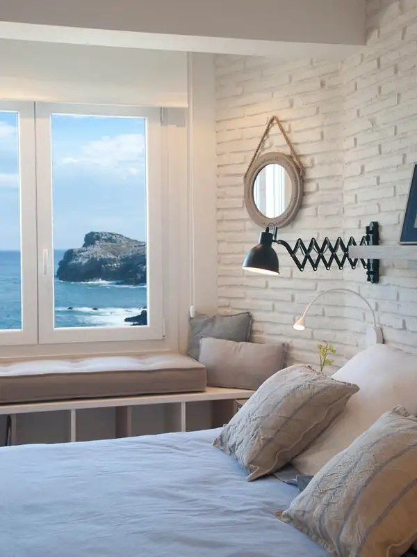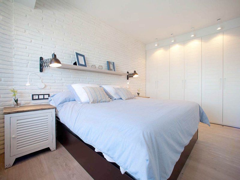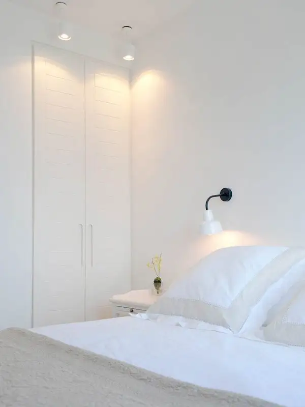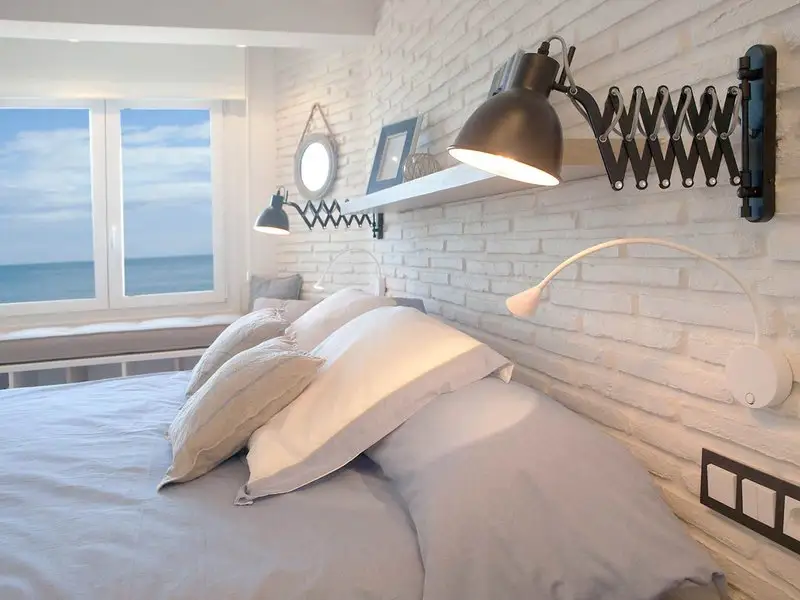 Mergand spre dormitor vom gasi aceeasi abordare minimalista, cu mult alb si textura de caramida ca element de accent. Camera ne inspira liniste, serenitate si relaxare. Din pat poti admira privelistea marii sau direct la fereastra intr-un asemanator ca in living. Dulapurile sunt incastrate intr-o nisa, cu lumini deasupra usilor si spatiu generos pentru depozitare.