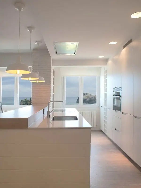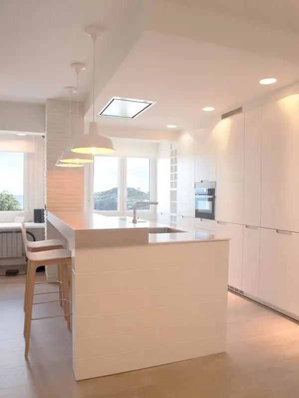 Zona de gatit este un spatiu minimalist tratat, cu un design unitar, cu fronturi albe, lucioase si electrocasnice incorporate in interiorul mobilierului. Spatii largi de depozitare, multa lumina naturala si un corp tip insula in care gasim chiuveta si plita. Pentru a masca aceste zone, a fost amenajat un blat tip bar la o inaltime potrivita.