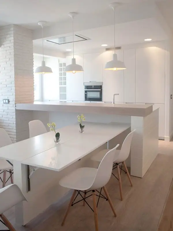 In acelasi timp, zona de living este despartita vizual de cea a bucatariei. spatiul dintre cele este destul de mare astfel incat sa permita extensia unei mese, in mod normal stransa in interiorul insulei de bucatarie.