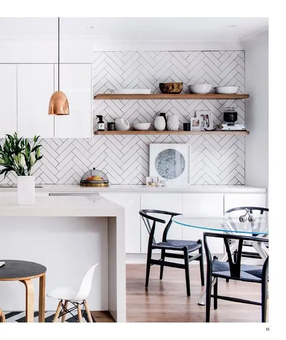 Rafturile suspendate pot aduce valoare bucatariei, pastrand vasele si paharele la vedere. Pentru un aspect lejer, poti elimina volumul oferit de dulapurile inchise in favoarea unor rafturi suspendate care ofera suficient spatiu pentru stocare.