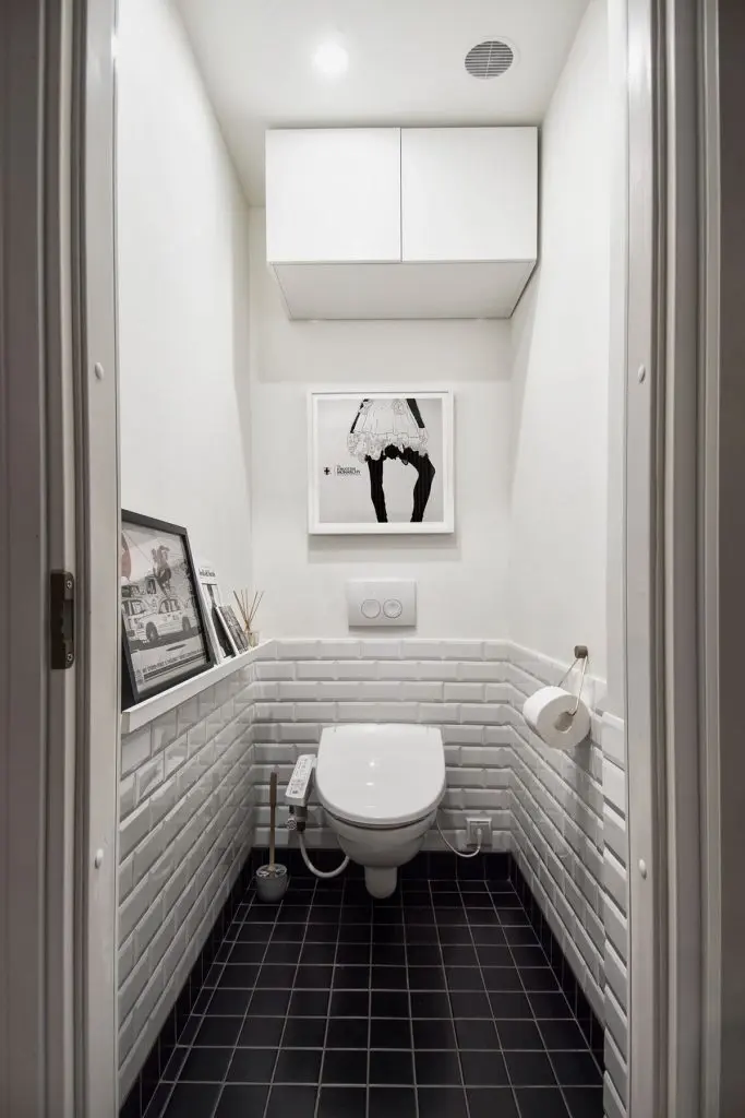 Acelasi stil nonconformist se pastreaza si in cele doua bai: cromatica simpla, alb-negru, mobilier putin si accesorizat cu rame.