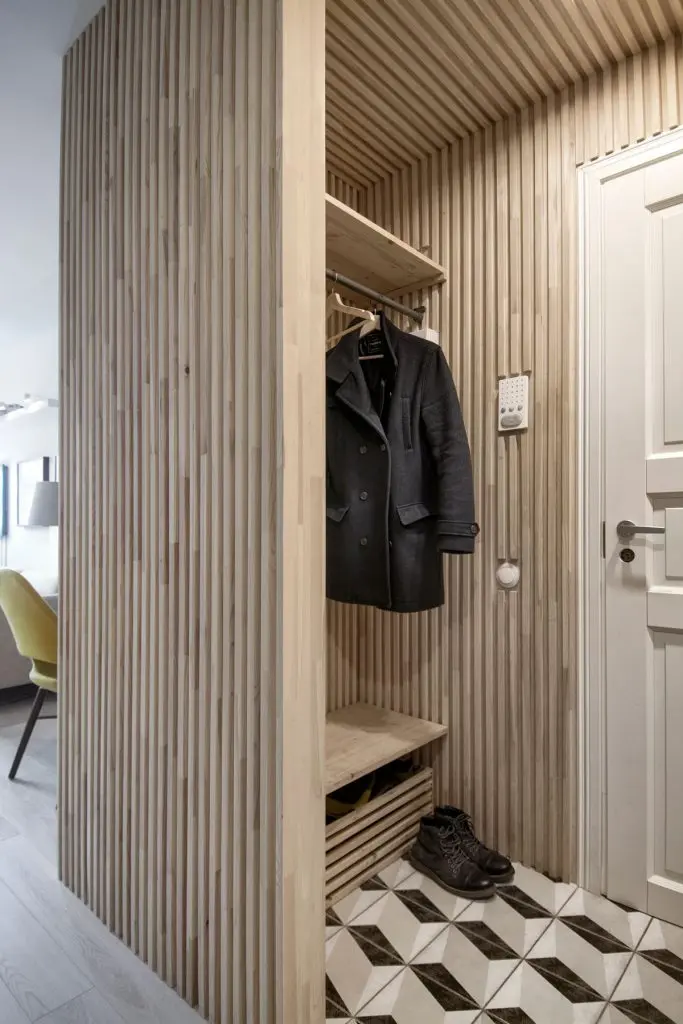 Biblioteca tine loc si de “masca” pentru usa de la intrare. Creata din lemn, poate fi o solutie pentru apartamentele care nu au holul de la intrare, sau pentru apartamentele mici, cand vrei sa castigi spatiu.