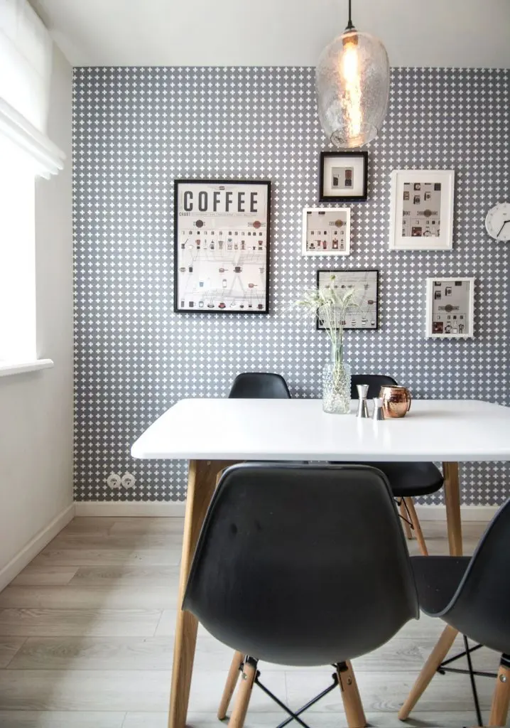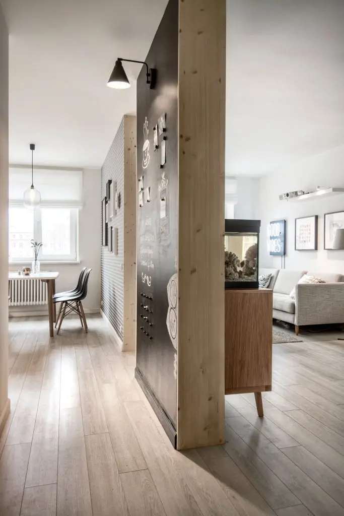 Bucataria este delimitata partial prin doua portiuni din perete. Pe acestea au fost aplicate un tapet decorativ si unul functional care imita tabla de scris si pe care proprietarii isi pot lasa mesaje.