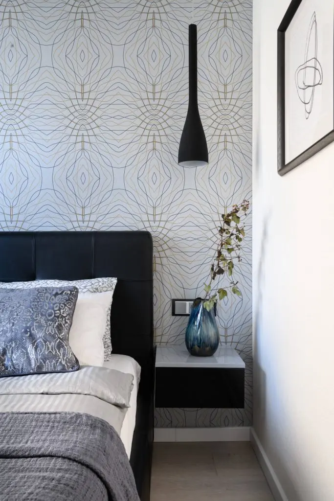 Centrul de interes al dormitorului matrimonial este patul foarte generos si tapitat. Simplitatea si functionalitatea sunt aduse in prim plan prin realizarea unui ambient modern care ne lasa imaginea unui spatiu elegant si rafinat Jocul de texturi, atentia la detalii si tapetul cu tema gometrica evita monotonia si creeaza un impact vizual placut. Pe un fundal predominat alb s-au integrat in schema cromatica nuante de gri, care echilibreaza spatiul, contribuind astfel la o atmosfera odihnitoare si relaxanta.