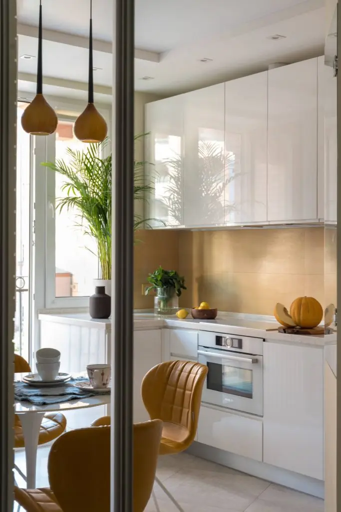 Desi spatiul nu este foarte generos, bucataria este dotata cu tot ce trebuie din punct de vedere functional. Mobila este minimalista, cu front lucios si are la baza sistemul push in ceea ce priveste deschiderea usilor si sertarelor. Lumina naturala patrunde cu usurinta prin usa de la balcon, reusind sa-si puna amprenta asupra intregului spatiu. Corpurile de iluminat, reusesc sa puna in valoare fiecare zona si impresia lasata este urmata de sentimentul unui spatiu plin de caldura si confort.
